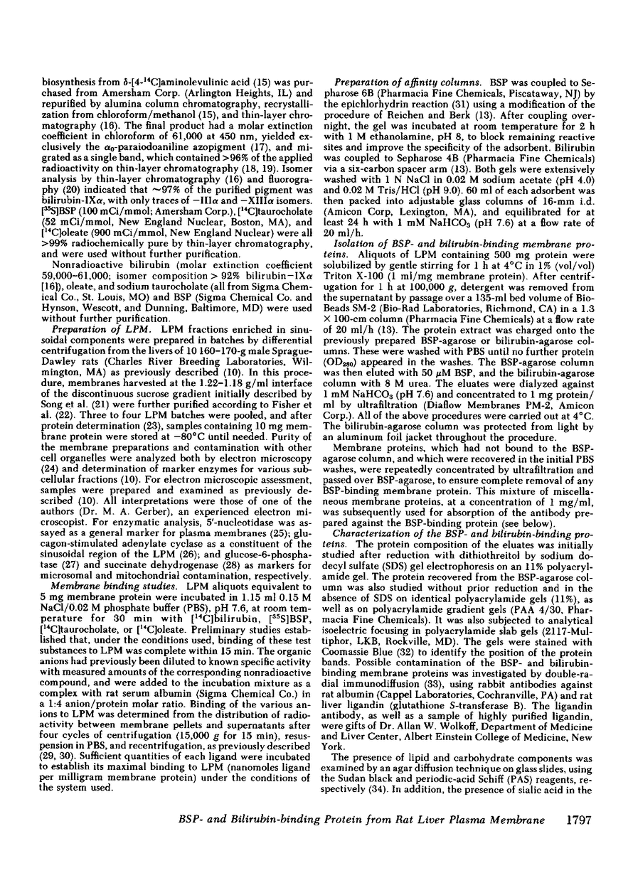 Affinity chromatography over bilirubinagarose and sulfobromophthalein (BSP)-agarose was used to isolate two proteins, with high affinities for bilirubin and BSP, respectively, from Triton X-100-solubilized rat liver plasma membranes. The protein eluted from either affinity column migrated as a single band of approximately 55,000 D on sodium dodecyl sulfate (SDS)-polyacrylamide gel electrophoresis, and either protein cochromatographed with both [14C]bilirubin and [35S]BSP on Sephadex G-75. On gradient gels without reduction or SDS, or on Sephadex G-150, the native BSP-binding protein had an estimated molecular mass of approximately 100,000 D. After incubation with SDS, an additional Sephadex G-150 peak of molecular mass of 56,000 D was observed. Both, the 100,000- and 56,000-D G-150 peaks cochromatographed with [35S]BSP. The native protein had an isoelectric point of 3.5, stained with periodic acid-Schiff but not Sudan black, and contained 4 mol of sialic acid per mol of protein. A rabbit antibody to the BSP-binding protein gave a line of identity with both the BSP- and bilirubin-binding antigens, and inhibited the binding of [14C]bilirubin and [35S]BSP, but not [14C]oleate or [14C]taurocholate, to rat liver plasma membranes. Immunohistochemical studies revealed the presence of the antigen on all surface domains of rat hepatocytes, but not on other cell populations from normal rat liver. It was not found in other organs. These data are compatible with the hypothesis that a specific liver cell plasma membrane protein mediates the hepatocytic sequestration of bilirubin and BSP.