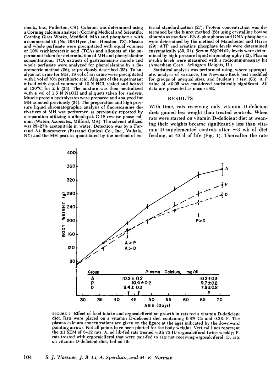 The myopathy associated with vitamin D deficiency was examined in vitamin D-deficient and vitamin D-supplemented rats. When compared with either vitamin D-supplemented ad lib. or pair-fed rats, weight gain and muscle mass were decreased in vitamin D-deficient hypocalcemic animals. With the exception of a modest decrease in muscle creatine phosphate levels, muscle composition was unchanged by vitamin D deficiency. Muscle protein turnover rates were determined in both in vivo and in vitro studies and demonstrated that myofibrillar protein degradation was increased in vitamin D deficiency. Normal growth rates could be maintained be feeding the rats vitamin D-deficient diets containing 1.6% calcium, which maintained plasma calcium within the normal range. In addition to its role in maintaining plasma calcium, vitamin D-supplemented rats had significantly higher levels of the anabolic hormone insulin. Vitamin D supplementation may affect muscle protein turnover by preventing hypocalcemia, as well as directly stimulating insulin secretion, rather than by a direct effect within skeletal muscle.