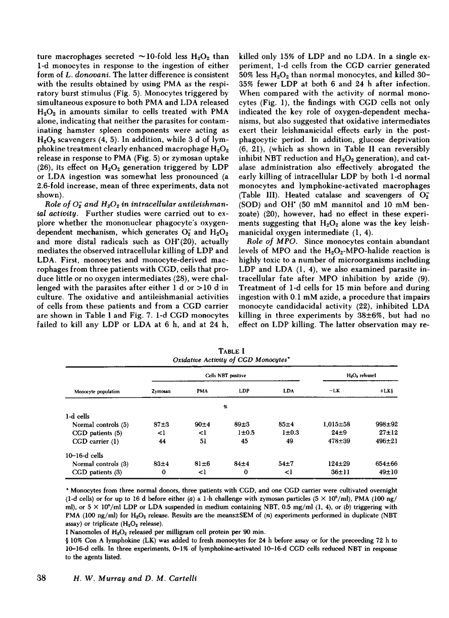 Human peripheral blood monocytes were cultivated for 1-30 d before assay for H2O2 release or challenge with Leishmania donovani promastigotes (LDP) or amastigotes (LDA). 1-d cells readily generated H2O2 in response to both phorbol myristate acetate triggering (1,013 +/- 58 nmol/mg protein . 90 min) and LDP ingestion, and killed 50% of LDP within 6 h, and 90% by 24 h. In contrast, the same cells released little H2O2 during LDA ingestion, killed no LDA at 6 h and less than 30% by 24 h, and supported intracellular LDA replication. Monocyte-derived macrophages (cells first cultivated for greater than or equal to 7 d) generated less than 125 nmol H2O2/mg . 90 min after phorbol myristate acetate triggering, killed neither LDP nor LDA, and permitted both forms to replicate. The addition of mitogen- or antigen-stimulated lymphokines, however, prevented the decline in monocyte oxidative capacity, enhanced macrophage H2O2 release by more than sixfold, and, in parallel, induced 1-d monocytes to kill LDA and cultivated macrophages to display both promastigocidal and amastigocidal activity. In comparison to 1-d monocytes and lymphokine-activated macrophages from normal donors, the same cells from patients with chronic granulomatous disease (CGD) or normal cells whose oxidative activity had been impaired by catalase pretreatment or glucose deprivation exerted considerably less or no antileishmanial activity during the early (6-24 h) postphagocytic period. By 48 h after infection, however, 1-d CGD monocytes and oxidatively impaired normal cells killed 40 and greater than 80% of LDP, respectively. Although a longer period of lymphokine stimulation was required and the resulting antileishmanial effects were not as rapid as with normal cells, activated CGD monocytes and macrophages also eventually achieved promastigocidal and amastigostatic activity. These results indicate that human mononuclear phagocytes utilize both oxygen-dependent and -independent mechanisms to achieve activity against ingested Leishmania, and also demonstrate (a) the differential susceptibilities of the two forms of L. donovani to intracellular killing, (b) the key role of oxygen intermediates in effective mononuclear phagocyte antimicrobial activity, (c) the capacity of lymphocyte products to enhance oxygen-dependent as well as -independent pathways, and (d) the vulnerability of the monocyte-derived macrophage to Leishmania infection in the absence of lymphokine stimulation.