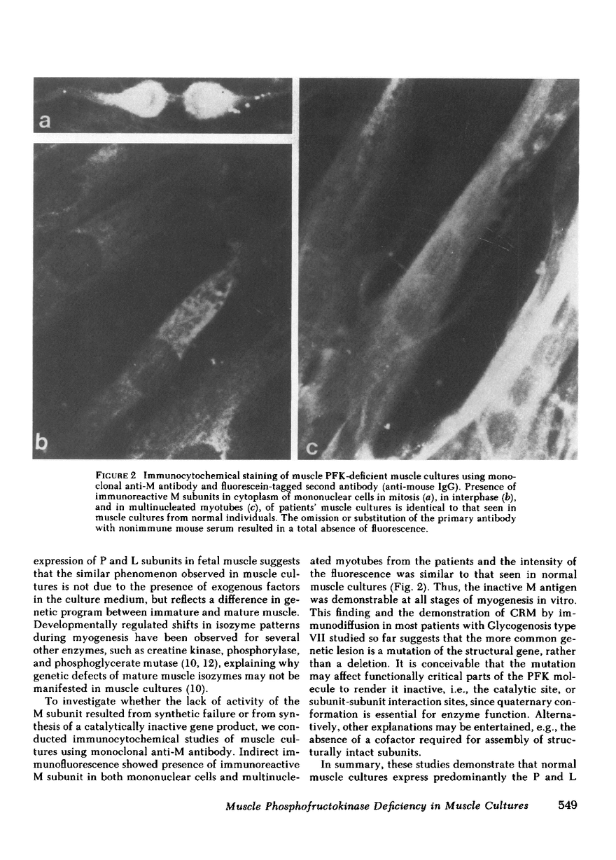 Muscle cultures from three unrelated patients with muscle phosphofructokinase (PFK; EC 2.7.1.11) deficiency (Glycogenosis type VII; Tarui disease) had normal PFK activity and normal morphology. Chromatographic and immunological studies showed that normal muscle cultures express all three PFK subunits, M (muscle-type), L (liver-type), and P (platelet-type) and contain multiple homotetrameric and heterotetrameric isozymes. Muscle cultures from patients lack catalytically active M subunit-containing isozymes, but this is compensated for by the presence of P- and L-containing isozymes. Despite the lack of muscle-type PFK activity, presence of immunoreactive M subunit was demonstrable by indirect immunofluorescence, suggesting a mutation of the structural gene coding for the M-subunit of PFK.