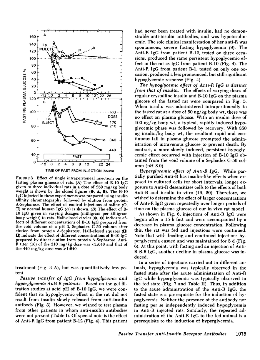 Patients with autoantibodies to the insulin receptor (Anti-R) may exhibit either fasting hypoglycemia or hyperglycemia and extreme insulin resistance. Occasionally, both these phenomena are observed in the same patient at different times in the clinical course. In an effort to understand what determines the patient's response to Anti-R, we developed an animal model of these clinical disorders by passive transfer of Anti-R IgG to rats. IgG fractions from the plasma of Anti-R patients and control subjects were prepared by affinity chromatography with staphylococcal protein A-Sepharose. Anti-R IgG, injected into fasting rats, induced severe and persistent hypoglycemia (plasma glucose 30-60 mg/dl). Rats injected with control IgG maintained a plasma glucose within the range of 75 (fasting) to 165 mg/dl (feeding). In comparison with the effects of insulin, the hypoglycemic response to Anti-R IgG had a slower onset (2-4 h) and lasted longer (8-24 h). Similar, dose-dependent hypoglycemic responses were observed in rats whether the Anti-R IgG was derived from an insulin-resistant or hypoglycemic patient. When Anti-R IgG was administered in sufficiently high doses for several days to fed rats, persistent hyperglycemia (plasma glucose 200-400 mg/dl) developed. Based on these in vivo and previous in vitro studies, we attribute the hypoglycemic response to an insulin-like effect of Anti-R, and the hyperglycemic response to a desensitization of host tissues to the effects of insulin, with more prolonged exposure to higher levels of Anti-R.