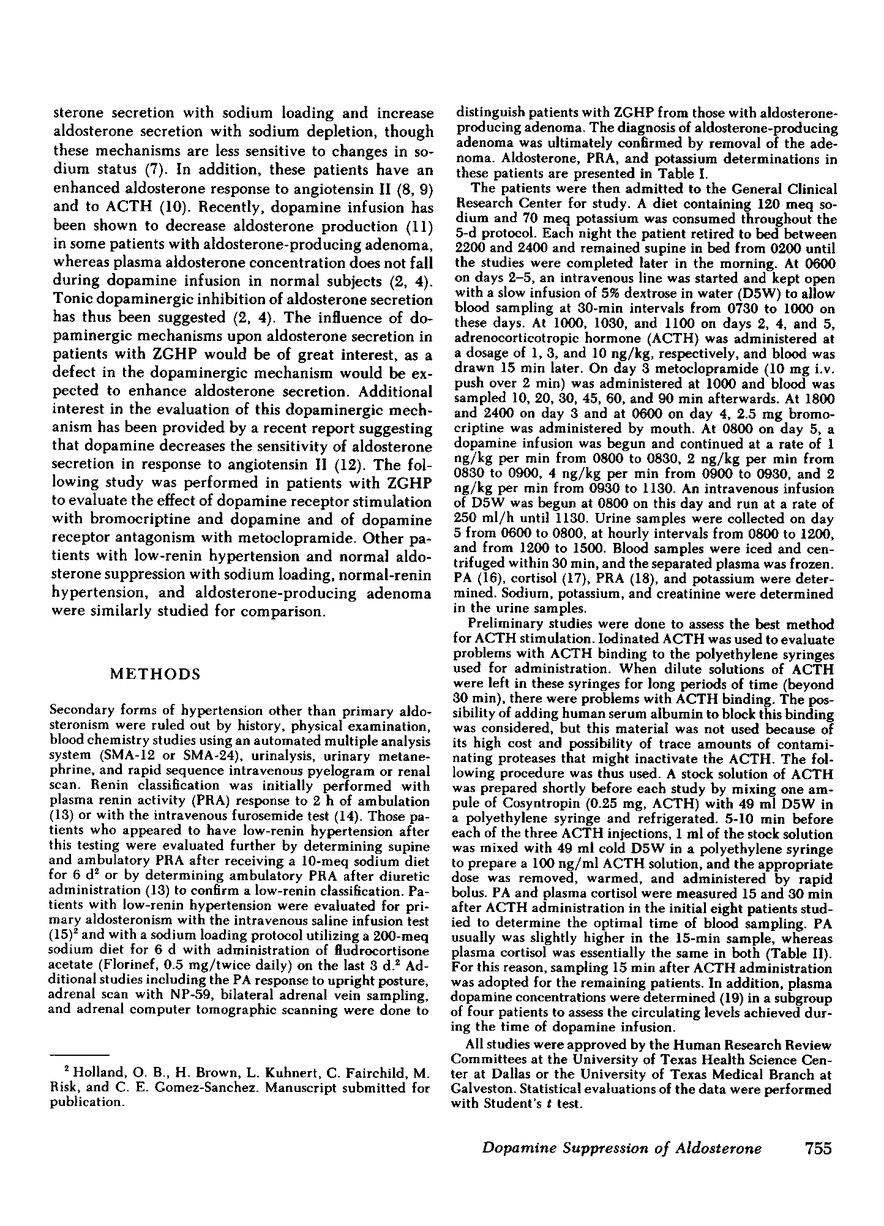 A dopaminergic mechanism has been proposed to suppress aldosterone secretion. To assess the possibility that a defect in the dopaminergic mechanism might enhance aldosterone secretion in hypertensive patients, we determined basal and adrenocorticotropic hormone (ACTH)-stimulated plasma aldosterone (PA), cortisol, renin activity, and potassium concentrations before and during dopamine receptor stimulation with dopamine infusion and bromocriptine administration and dopamine receptor blockade with metoclopramide. The patient study groups included: (a) seven patients with low-renin hypertension and abnormal aldosterone suppression with sodium loading and presumed bilateral zona glomerulosa hyperplasia (ZGHP); (b) two patients with aldosterone-producing adenoma; (c) five patients with low-renin hypertension but normal aldosterone suppression with sodium loading; and (d) six patients with normal-renin hypertension. Dopamine infusion in patients with ZGHP caused PA to fall (P less than 0.01) into the normal range, but did not block the enhanced (P less than 0.05) aldosterone response to ACTH that is characteristic of these patients. Dopamine infusion in patients with low-renin hypertension but normal aldosterone suppression also suppressed PA (P less than 0.01), whereas it had no effect upon PA in patients with normal-renin hypertension or aldosterone-producing adenoma and did not blunt the PA response to ACTH in either group. Bromocriptine administration had no effect upon basal or ACTH-stimulated PA. Dopamine infusion in patients with ZGHP also enhanced (P less than 0.05) diuresis and natriuresis in comparison with normal-renin patients. Metoclopramide administration increased (P less than 0.01) PA in all patients. Thus, a dopaminergic mechanism appears to be important in the regulation of aldosterone secretion in patients with ZGHP and in other low-renin hypertensives with normal aldosterone suppression with sodium loading. In contrast, this latter group does not exhibit an enhanced aldosterone response to ACTH. Both of these groups differ from normal-renin hypertensives, who have no PA suppression with dopamine infusion.