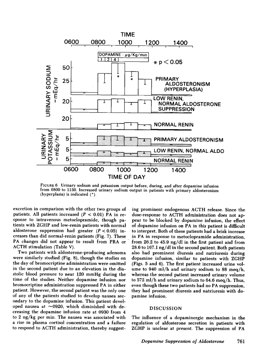 A dopaminergic mechanism has been proposed to suppress aldosterone secretion. To assess the possibility that a defect in the dopaminergic mechanism might enhance aldosterone secretion in hypertensive patients, we determined basal and adrenocorticotropic hormone (ACTH)-stimulated plasma aldosterone (PA), cortisol, renin activity, and potassium concentrations before and during dopamine receptor stimulation with dopamine infusion and bromocriptine administration and dopamine receptor blockade with metoclopramide. The patient study groups included: (a) seven patients with low-renin hypertension and abnormal aldosterone suppression with sodium loading and presumed bilateral zona glomerulosa hyperplasia (ZGHP); (b) two patients with aldosterone-producing adenoma; (c) five patients with low-renin hypertension but normal aldosterone suppression with sodium loading; and (d) six patients with normal-renin hypertension. Dopamine infusion in patients with ZGHP caused PA to fall (P less than 0.01) into the normal range, but did not block the enhanced (P less than 0.05) aldosterone response to ACTH that is characteristic of these patients. Dopamine infusion in patients with low-renin hypertension but normal aldosterone suppression also suppressed PA (P less than 0.01), whereas it had no effect upon PA in patients with normal-renin hypertension or aldosterone-producing adenoma and did not blunt the PA response to ACTH in either group. Bromocriptine administration had no effect upon basal or ACTH-stimulated PA. Dopamine infusion in patients with ZGHP also enhanced (P less than 0.05) diuresis and natriuresis in comparison with normal-renin patients. Metoclopramide administration increased (P less than 0.01) PA in all patients. Thus, a dopaminergic mechanism appears to be important in the regulation of aldosterone secretion in patients with ZGHP and in other low-renin hypertensives with normal aldosterone suppression with sodium loading. In contrast, this latter group does not exhibit an enhanced aldosterone response to ACTH. Both of these groups differ from normal-renin hypertensives, who have no PA suppression with dopamine infusion.