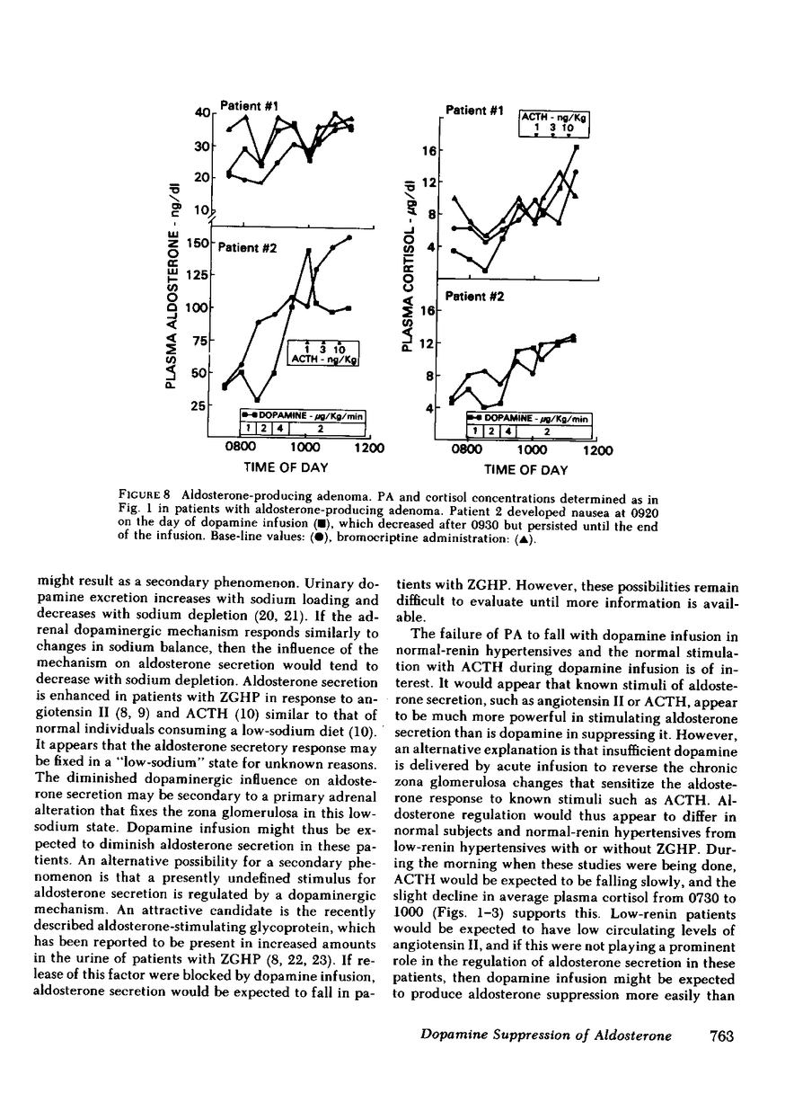 A dopaminergic mechanism has been proposed to suppress aldosterone secretion. To assess the possibility that a defect in the dopaminergic mechanism might enhance aldosterone secretion in hypertensive patients, we determined basal and adrenocorticotropic hormone (ACTH)-stimulated plasma aldosterone (PA), cortisol, renin activity, and potassium concentrations before and during dopamine receptor stimulation with dopamine infusion and bromocriptine administration and dopamine receptor blockade with metoclopramide. The patient study groups included: (a) seven patients with low-renin hypertension and abnormal aldosterone suppression with sodium loading and presumed bilateral zona glomerulosa hyperplasia (ZGHP); (b) two patients with aldosterone-producing adenoma; (c) five patients with low-renin hypertension but normal aldosterone suppression with sodium loading; and (d) six patients with normal-renin hypertension. Dopamine infusion in patients with ZGHP caused PA to fall (P less than 0.01) into the normal range, but did not block the enhanced (P less than 0.05) aldosterone response to ACTH that is characteristic of these patients. Dopamine infusion in patients with low-renin hypertension but normal aldosterone suppression also suppressed PA (P less than 0.01), whereas it had no effect upon PA in patients with normal-renin hypertension or aldosterone-producing adenoma and did not blunt the PA response to ACTH in either group. Bromocriptine administration had no effect upon basal or ACTH-stimulated PA. Dopamine infusion in patients with ZGHP also enhanced (P less than 0.05) diuresis and natriuresis in comparison with normal-renin patients. Metoclopramide administration increased (P less than 0.01) PA in all patients. Thus, a dopaminergic mechanism appears to be important in the regulation of aldosterone secretion in patients with ZGHP and in other low-renin hypertensives with normal aldosterone suppression with sodium loading. In contrast, this latter group does not exhibit an enhanced aldosterone response to ACTH. Both of these groups differ from normal-renin hypertensives, who have no PA suppression with dopamine infusion.