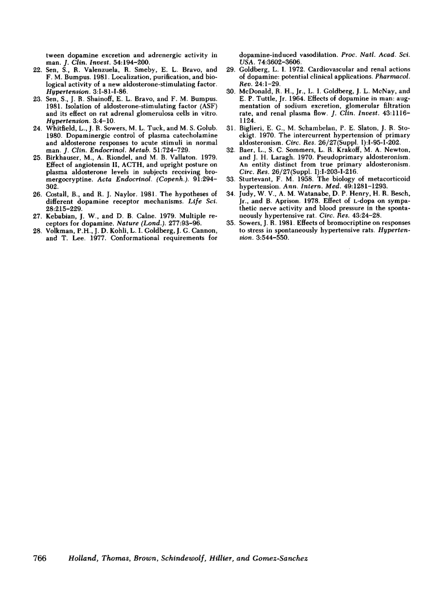 A dopaminergic mechanism has been proposed to suppress aldosterone secretion. To assess the possibility that a defect in the dopaminergic mechanism might enhance aldosterone secretion in hypertensive patients, we determined basal and adrenocorticotropic hormone (ACTH)-stimulated plasma aldosterone (PA), cortisol, renin activity, and potassium concentrations before and during dopamine receptor stimulation with dopamine infusion and bromocriptine administration and dopamine receptor blockade with metoclopramide. The patient study groups included: (a) seven patients with low-renin hypertension and abnormal aldosterone suppression with sodium loading and presumed bilateral zona glomerulosa hyperplasia (ZGHP); (b) two patients with aldosterone-producing adenoma; (c) five patients with low-renin hypertension but normal aldosterone suppression with sodium loading; and (d) six patients with normal-renin hypertension. Dopamine infusion in patients with ZGHP caused PA to fall (P less than 0.01) into the normal range, but did not block the enhanced (P less than 0.05) aldosterone response to ACTH that is characteristic of these patients. Dopamine infusion in patients with low-renin hypertension but normal aldosterone suppression also suppressed PA (P less than 0.01), whereas it had no effect upon PA in patients with normal-renin hypertension or aldosterone-producing adenoma and did not blunt the PA response to ACTH in either group. Bromocriptine administration had no effect upon basal or ACTH-stimulated PA. Dopamine infusion in patients with ZGHP also enhanced (P less than 0.05) diuresis and natriuresis in comparison with normal-renin patients. Metoclopramide administration increased (P less than 0.01) PA in all patients. Thus, a dopaminergic mechanism appears to be important in the regulation of aldosterone secretion in patients with ZGHP and in other low-renin hypertensives with normal aldosterone suppression with sodium loading. In contrast, this latter group does not exhibit an enhanced aldosterone response to ACTH. Both of these groups differ from normal-renin hypertensives, who have no PA suppression with dopamine infusion.