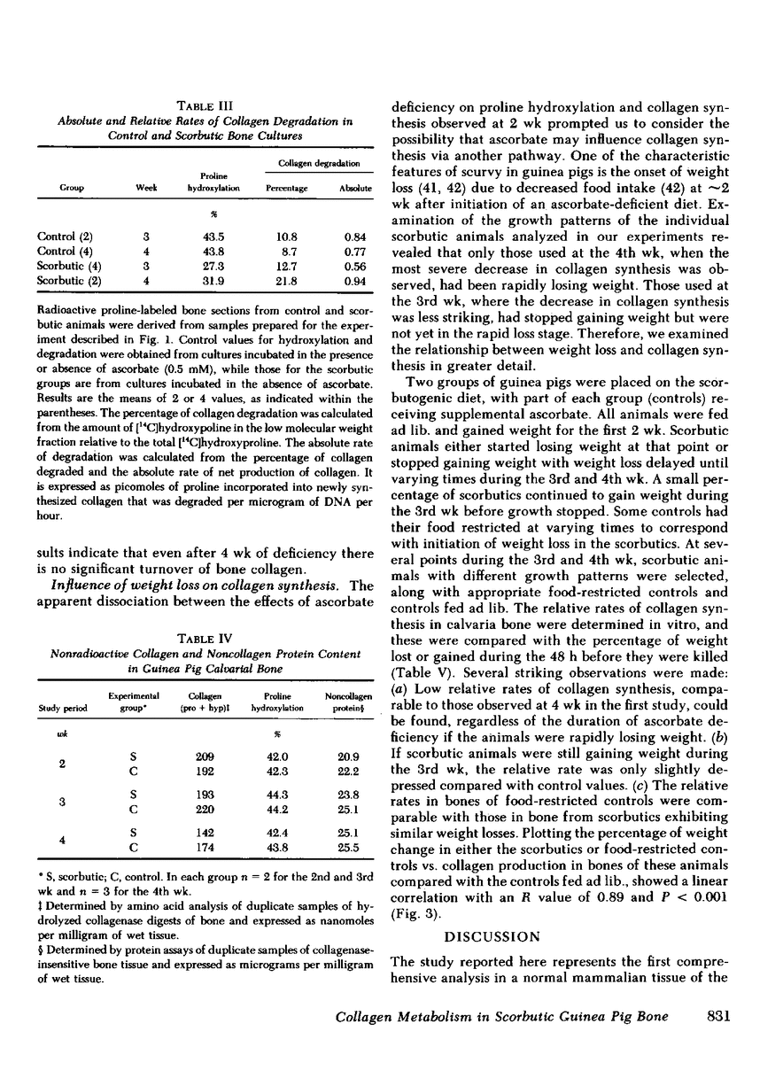 The question whether ascorbate regulates collagen production solely through its direct role in proline hydroxylation was investigated. Proteins in calvarial bones from control and scorbutic weanling guinea pigs were labeled in short-term cultures with radioactive proline. Proteins were digested with purified bacterial collagenase to distinguish between effects on collagen polypeptide production and hydroxyproline formation. There was a preferential decrease in the absolute rate of collagen biosynthesis beginning after 2 wk of ascorbate deficiency, and this effect was temporally dissociated from decreased proline hydroxylation. There were no significant changes in the absolute rates of collagen degradation or noncollagen protein production. In vitro inhibition of proline hydroxylation in normal bone with alpha, alpha'-dipyridyl did not affect the relative rate of collagen synthesis, further dissociating these functions. Ascorbate added to scorbutic bone cultures reversed defective proline hydroxylation but not defective collagen synthesis, suggesting that the latter was an indirect effect of scurvy. There was a linear correlation between the extent of body weight lost during the 3rd and 4th wk of scurvy and the rate of collagen synthesis in scorbutic bone. This correlation also applied to control animals receiving ascorbate, but with weight loss induced by food restriction. These studies establish for the first time that ascorbate deficiency in guinea pigs leads to a specific decrease in collagen polypeptide synthesis and suggest that this decrease results from the reduced food intake and/or weight-loss characteristic of scurvy.