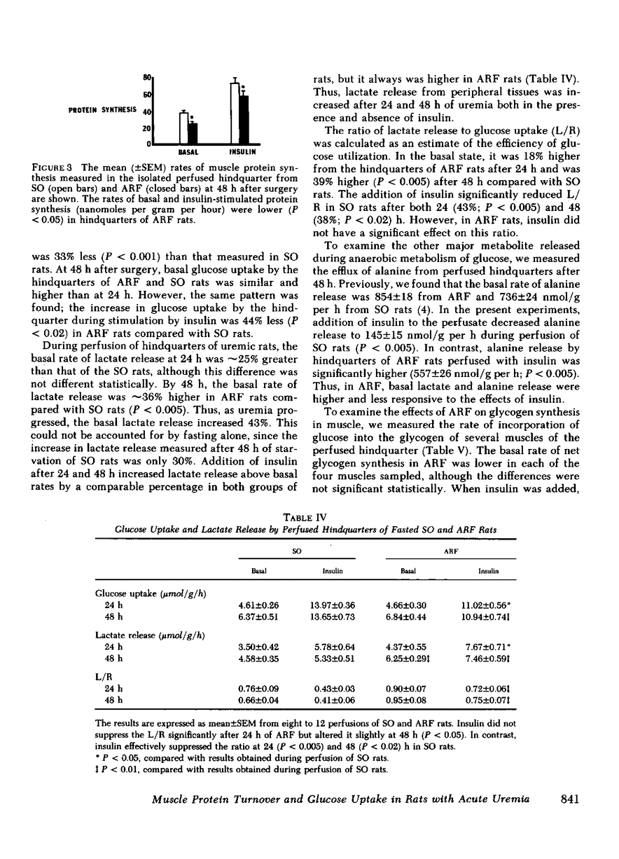 Acute renal failure (ARF) in rats is associated with increased amino acid release from peripheral tissues and insulin resistance. To study whether abnormal protein and carbohydrate metabolism are linked in ARF, the effects of insulin on net muscle protein degradation (T) and on glucose uptake were measured in the perfused hindquarters of paired ARF and sham-operated (SO) rats. The basal rate of T increased 40% after 24 and 98% after 48 h of ARF. Insulin was less effective in decreasing T in ARF (-79% SO vs. -22% ARF 24 h and -64% SO vs. -23% ARF 48 h; P less than 0.01). Protein synthesis (PS) and protein degradation (PD) were measured independently in incubated epitrochlearis muscles; the increase in T after 24 h of ARF was due specifically to increased PD, while PS was unchanged. At this stage, insulin was less effective in decreasing PD in ARF (-10% ARF vs. -23% SO; P less than 0.02), although PS responded normally. After 48 h of ARF, the further increment in T was caused by the additional appearance of depressed basal and insulin-stimulated PS. This was confirmed in the perfused hindquarter (26 +/- 3 ARF vs. 38 +/- 3 SO, basal; 54 +/- 5 ARF vs 73 +/- 7 SO, insulin-stimulated, nmol phenylalanine/g per h; P less than 0.05). Although basal glucose uptake by hindquarters of ARF and SO rats was comparable, insulin-stimulated glucose uptake was 33% less at 24 and 44% less after 48 h of ARF. After 48 h of ARF, lactate and alanine release were increased and net glycogen synthesis in muscle was depressed. These abnormalities were even more apparent in the presence of insulin. Inefficient glucose utilization, estimated as the ratio of lactate release to glucose uptake, was correlated with T (r = +0.78; P less than 0.001). In conclusion, after 24 h of ARF, both increased PD and altered glucose utilization could be detected. After 48 h of ARF, T increased further because PS was depressed. At this time, glucose utilization was clearly abnormal and the results suggest that abnormal net protein degradation in ARF may be a consequence of defective glucose utilization.
