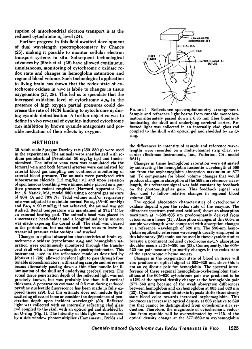 The sensitivity of the brain to cyanide-induced histotoxic hypoxia and the protective effects of known cyanide antagonists, have been assessed in vivo by reflectance spectrophotometry. Cyanide-related changes in cytochrome a,a3 (cytochrome c oxidase) oxidation-reduction (redox) state, tissue hemoglobin saturation, and local blood volume were continuously monitored in cerebral cortex of rats. Noncumulative, dose-dependent inhibition of the in situ mitochondrial respiratory chain was evaluated directly by measuring increases in reduction levels of the terminal oxidase. These transient cytochrome a,a3 reductions were accompanied by increases in regional cerebral hemoglobin saturation and blood volume. Cytochrome redox responses were not altered either in magnitude or kinetics by hyperoxia; however, the cyanide-cytochrome dose-response curve was greatly shifted to the right by pretreatment with sodium nitrite, and the recovery rate of cytochrome a,a3 from cyanide-induced reduction was enhanced fourfold by pretreatment with sodium thiosulfate.