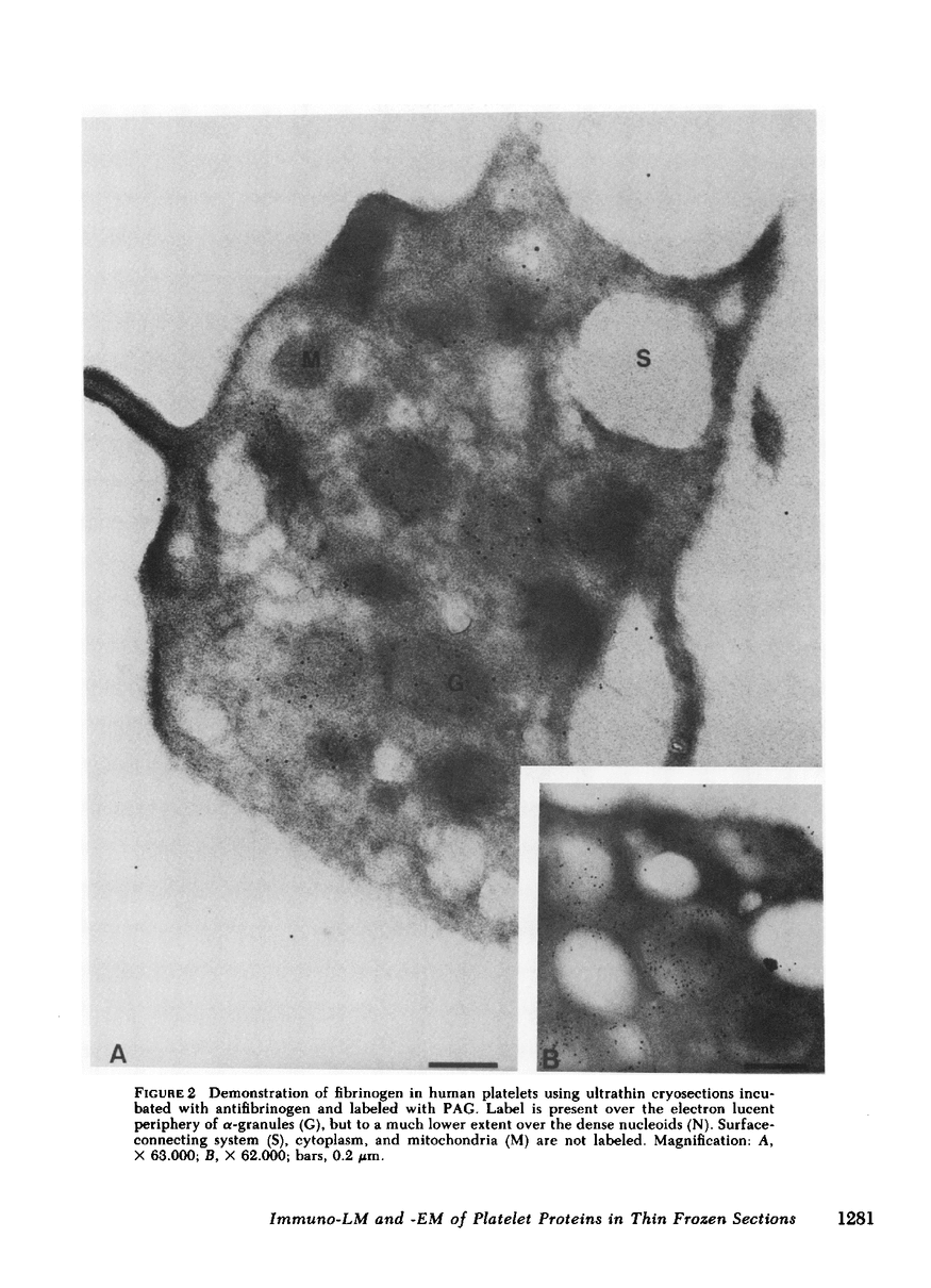 Affinity-purified monospecific antibodies against human fibrinogen and the platelet-specific proteins platelet factor 4 and beta thromboglobulin were used to localize these antigens in thin and ultra-thin frozen sections of mildly fixed, washed human blood platelets. By immunofluorescent double-labeling experiments the distribution of fibrinogen was compared to that of platelet factor 4 and beta thromboglobulin. All three antigens occurred in virtually all platelets and showed and identical, dotlike distribution. For immunoelectron microscopy we used protein A-colloidal gold on ultra-thin frozen sections to visualize the specific reaction indirectly. The staining for platelet factor 4, beta thromboglobulin, and fibrinogen localized exclusively over alpha-granules of washed platelets. Within the granules, platelet factor 4 was localized preferentially in the electron dense, alpha-granule nucleoid, whereas fibrinogen was more predominant in the electron-lucent granule periphery. Beta thromboglobulin localization did not show a preferential intragranular distribution.