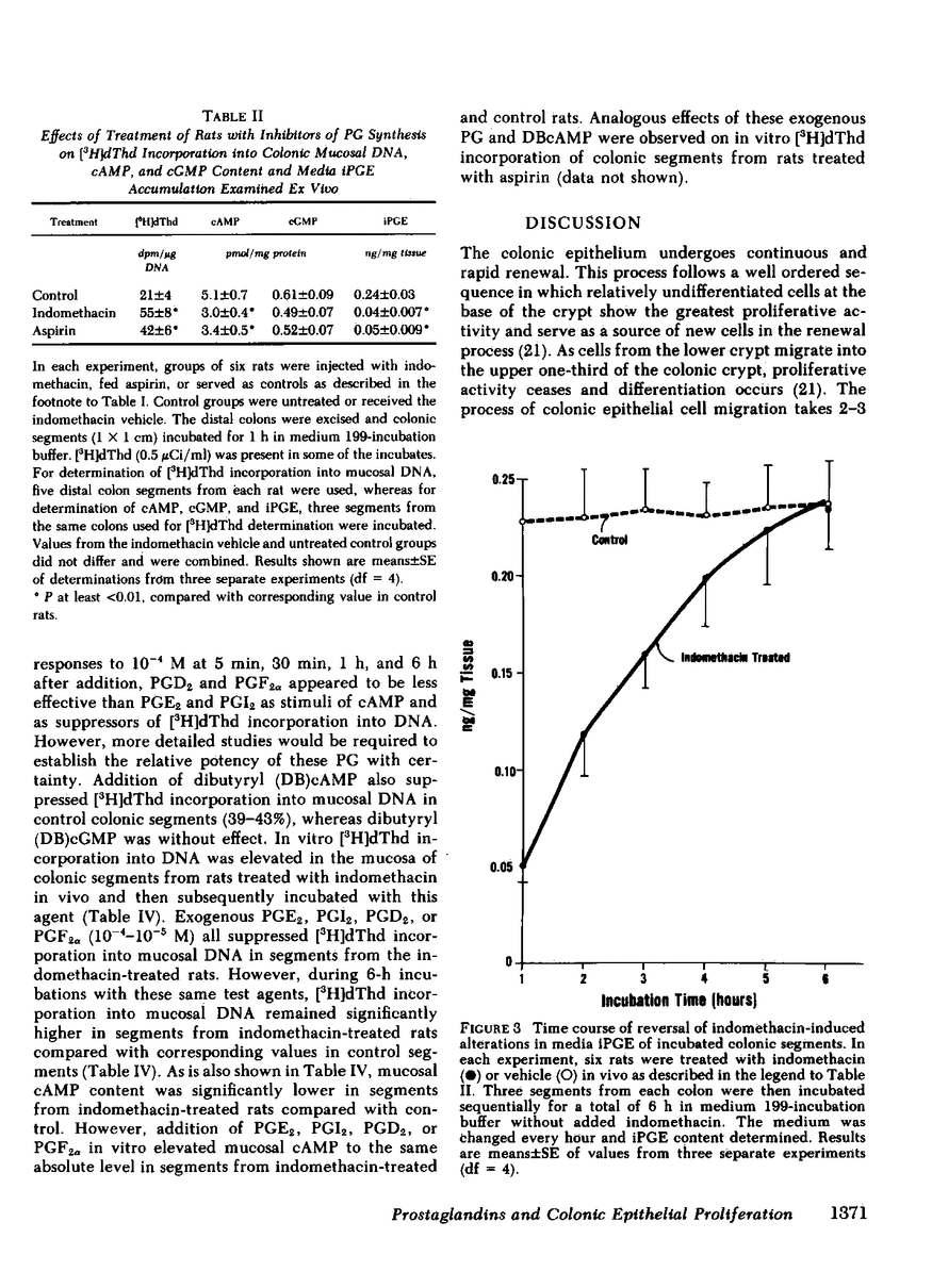 The role of local prostaglandin (PG) synthesis in the modulation of the proliferative activity of colonic epithelium was examined in rat colon. Experimental rats were given either indomethacin (5 mg/kg s.c. every 8 h for three doses) or aspirin (0.5 g/100 g diet for 3 d). In rats treated with indomethacin or aspirin, the incorporation of [3H]thymidine (dThd) into DNA in vivo was increased approximately twofold over control in mucosal scrapings from distal colon, and approximately threefold over control in the proliferating pool of epithelial cells isolated from distal colon. [3H]dThd incorporation into DNA was also examined ex vivo immediately after distal colonic resection. It was approximately twofold higher in mucosa of colonic segments (1-h incubation) from rats treated with indomethacin or aspirin in vivo, compared with corresponding values of segments from control rats. Immunoreactive (i) prostaglandin E (PGE), the dominant PG product of colon segment incubates by high-performance liquid chromatography analysis of [14C]arachidonate metabolites, was markedly (95%) reduced in the media of 1-h colon incubates from indomethacin- or aspirin-treated rats, compared with control rats. Moreover, the cyclic (c)AMP content of mucosa of segments from indomethacin- or aspirin-treated rats was significantly lower than that of control rats. Prolonged incubation (4-24 h) of colonic segments from indomethacin-treated rats, in the absence of indomethacin in vitro, led to an eventual return of [3H]dThd incorporation into DNA, iPGE, and mucosal cAMP to control values. Conversely, inclusion of indomethacin (0.25 mM) in the incubations (6 h) of colonic segments from indomethacin-treated rats resulted in persistent suppression of iPGE and mucosal cAMP, as well as persistent enhancement of [3H]dThd incorporation into mucosal DNA. However, incubation of colonic segments from control rats (no in vivo drug exposure) with indomethacin or aspirin in vitro for periods up to 24 h failed to alter DNA synthesis, despite marked reduction in media iPGE and lower mucosal cAMP. The latter observations suggested that additional in vivo factors initiated the enhancement of DNA synthesis in indomethacin- or aspirin-treated rats. Exogenous PGE2, D2, I2, or F2 alpha, each of which increased the endogenous mucosal cAMP content of incubated colonic segments from control, indomethacin- or aspirin-treated rats, all suppressed [3H]dThd incorporation into mucosal DNA in vitro. Dibutyryl cAMP, but not dibutyryl cGMP, had an analogous suppressive effect on in vitro [3H]dThd incorporation into DNA. Thus, the present observations are consistent with an inhibitory action of endogenous colonic PG synthesis on the proliferative activity of colonic epithelium. This action may be mediated through cAMP.