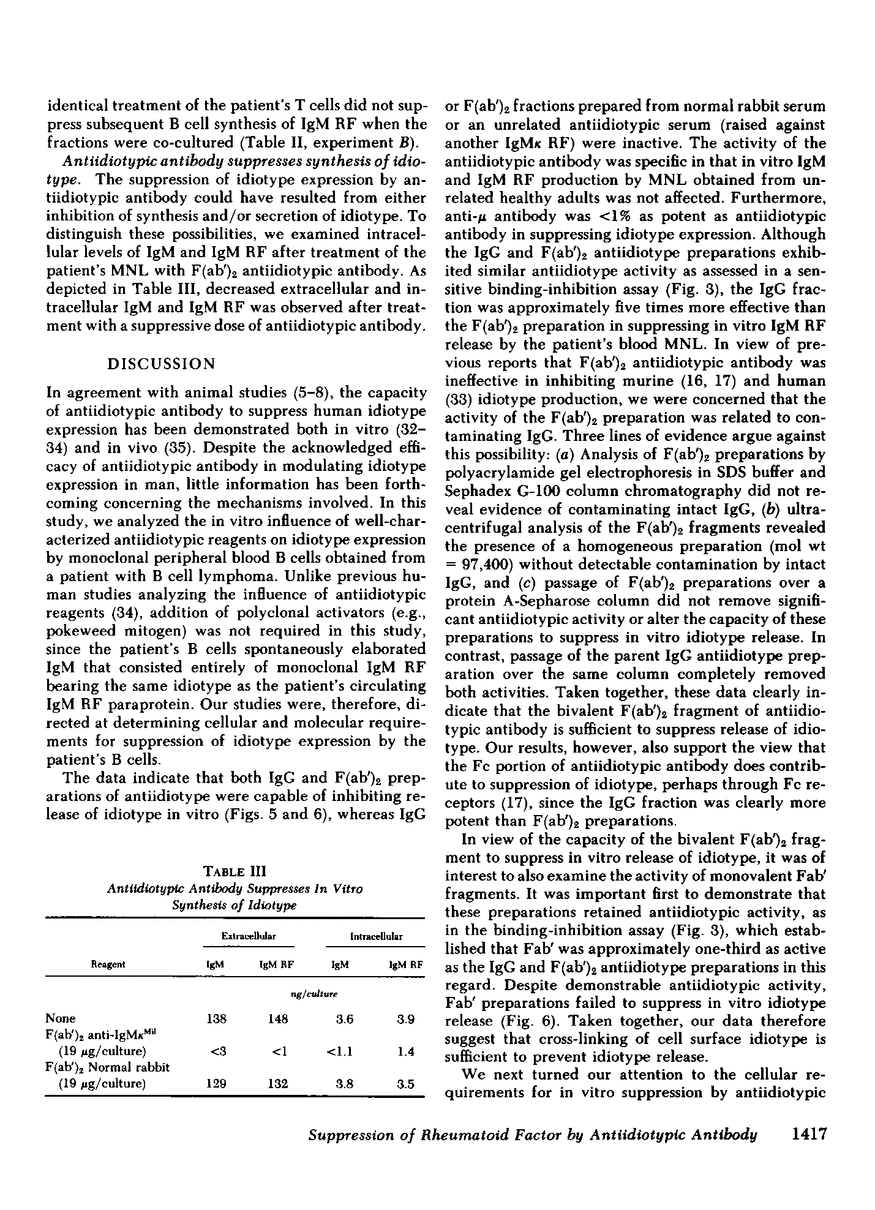 Previous studies have indicated that antiidiotypic antibody can modulate expression of idiotype both in vivo and in vitro. Although the precise mechanisms underlying modulation of idiotype expression by antiidiotype remains unclear, a requirement for intact IgG antiidiotypic antibody has been suggested and T cells appear to play a role in some systems. We have studied peripheral blood mononuclear leukocytes (MNL) from a patient with a B cell lymphoma and a circulating IgMK rheumatoid factor (RF) paraprotein in an effort to delineate mechanisms involved in regulation of idiotype expression by antiidiotypic antibody. 1-10% of MNL from this patient could be cytoplasmically stained with specific F(ab')2 antiidiotypic antibody. MNL from the patient spontaneously synthesized IgM RF in culture that possessed the same idiotype as the circulating IgM RF paraprotein. Production of RF by MNL was suppressed by pretreatment with either intact IgG or the F(ab')2 fragments of antiidiotypic antibody (50% inhibitory concentration was 0.2 and 1.1 micrograms/culture, respectively). In contrast, the Fab' fragment of antiidiotypic antibody was not inhibitory (up to 57 micrograms/culture) despite retaining demonstrable antiidiotype activity. Suppression of RF production was not observed over the same concentration range with the IgG or F(ab')2 fractions of a non-cross-reactive antiidiotypic antibody prepared against another monoclonal IgMK RF paraprotein or with IgG or F(ab')2 fractions prepared from normal rabbit serum. Inhibition of RF production by antiidiotypic antibody did not require T cells. Antiidiotypic antibody decreased intracellular and extracellular levels of idiotype indicating diminished synthesis of idiotype by the patient's B cells. Synthesis of IgM RF by MNL obtained from unrelated donors was not suppressed by the antiidiotypic antibody specific for the patient's paraprotein. The results indicate that (a) antiidiotypic antibody is capable of directly suppressing human B cell release of idiotype, (b) the bivalent antigen-binding fragment (F[ab']2) of antiidiotypic antibody is sufficient for mediating such suppression, (c) an intact Fc portion of antiidiotypic antibody enhances suppression of idiotype, and (d) antiidiotypic antibody inhibits idiotype expression by suppressing synthesis of idiotype.