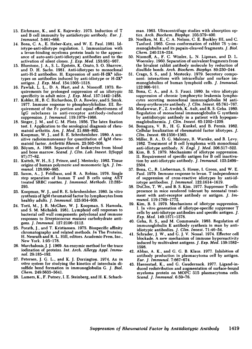 Previous studies have indicated that antiidiotypic antibody can modulate expression of idiotype both in vivo and in vitro. Although the precise mechanisms underlying modulation of idiotype expression by antiidiotype remains unclear, a requirement for intact IgG antiidiotypic antibody has been suggested and T cells appear to play a role in some systems. We have studied peripheral blood mononuclear leukocytes (MNL) from a patient with a B cell lymphoma and a circulating IgMK rheumatoid factor (RF) paraprotein in an effort to delineate mechanisms involved in regulation of idiotype expression by antiidiotypic antibody. 1-10% of MNL from this patient could be cytoplasmically stained with specific F(ab')2 antiidiotypic antibody. MNL from the patient spontaneously synthesized IgM RF in culture that possessed the same idiotype as the circulating IgM RF paraprotein. Production of RF by MNL was suppressed by pretreatment with either intact IgG or the F(ab')2 fragments of antiidiotypic antibody (50% inhibitory concentration was 0.2 and 1.1 micrograms/culture, respectively). In contrast, the Fab' fragment of antiidiotypic antibody was not inhibitory (up to 57 micrograms/culture) despite retaining demonstrable antiidiotype activity. Suppression of RF production was not observed over the same concentration range with the IgG or F(ab')2 fractions of a non-cross-reactive antiidiotypic antibody prepared against another monoclonal IgMK RF paraprotein or with IgG or F(ab')2 fractions prepared from normal rabbit serum. Inhibition of RF production by antiidiotypic antibody did not require T cells. Antiidiotypic antibody decreased intracellular and extracellular levels of idiotype indicating diminished synthesis of idiotype by the patient's B cells. Synthesis of IgM RF by MNL obtained from unrelated donors was not suppressed by the antiidiotypic antibody specific for the patient's paraprotein. The results indicate that (a) antiidiotypic antibody is capable of directly suppressing human B cell release of idiotype, (b) the bivalent antigen-binding fragment (F[ab']2) of antiidiotypic antibody is sufficient for mediating such suppression, (c) an intact Fc portion of antiidiotypic antibody enhances suppression of idiotype, and (d) antiidiotypic antibody inhibits idiotype expression by suppressing synthesis of idiotype.