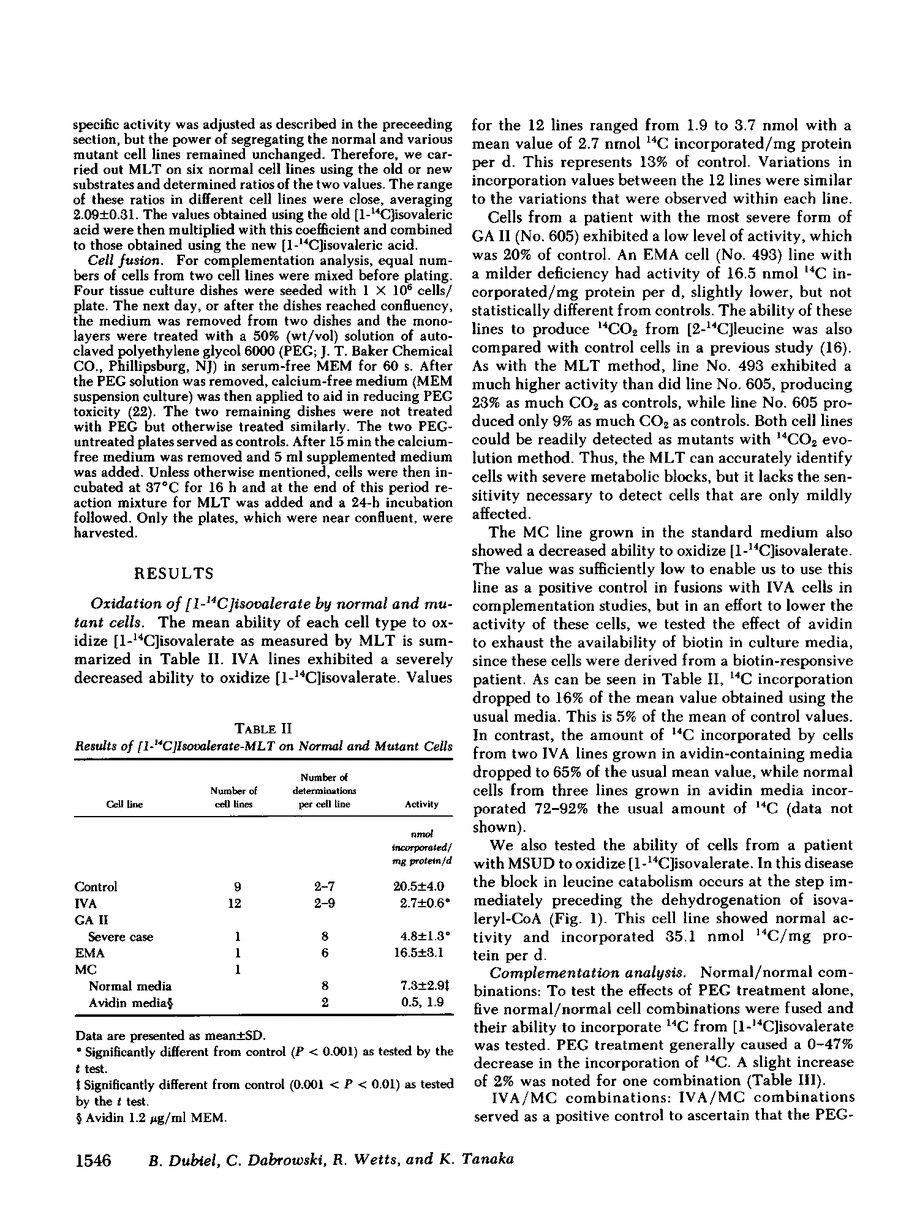 Using cultured skin fibroblasts, we studied the heterogeneity of inborn errors of leucine metabolism such as isovaleric acidemia (IVA), glutaric aciduria type II (GA II), and multiple carboxylase deficiency (MC). We first developed a simple macromolecular-labeling test to measure the ability of cells to oxidize [1-14C]isovaleric acid in situ in culture. Cells from two different lines were fused using polyethylene glycol, and the ability of the heterokaryons to oxidize [1-14C]isovaleric acid was tested by the macromolecular-labeling test. The MC line complemented with all 10 IVA lines tested; heterokaryons showed 99 +/- 68% more activity than the unfused mixture of component cells. GA II/IVA heterokaryons exhibited poor growth, but when the culture remained confluent, the GA II cells complemented with all six IVA lines tested, showing a 71 +/- 41% increase in activity. The relatively large standard deviations are due to a few experiments in which significant enhancement of macromolecular-labeling test activity was not observed upon fusion, but significant complementation was clearly observed in repeats of the same combinations. These results are consistent with our previous findings, which indicated that the decreased ability of GA II cells to oxidize isovaleryl-CoA involves a defective electron-transporting system rather than a defective isovaleryl-CoA dehydrogenase. IVA/IVA heterokaryons showed no complementation in any combination tested, indicating no detectable heterogeneity in isovaleric acidemia. This finding indicates that the same gene is mutated in all IVA lines. Previous results indicated that this gene codes for isovaleryl-CoA dehydrogenase.