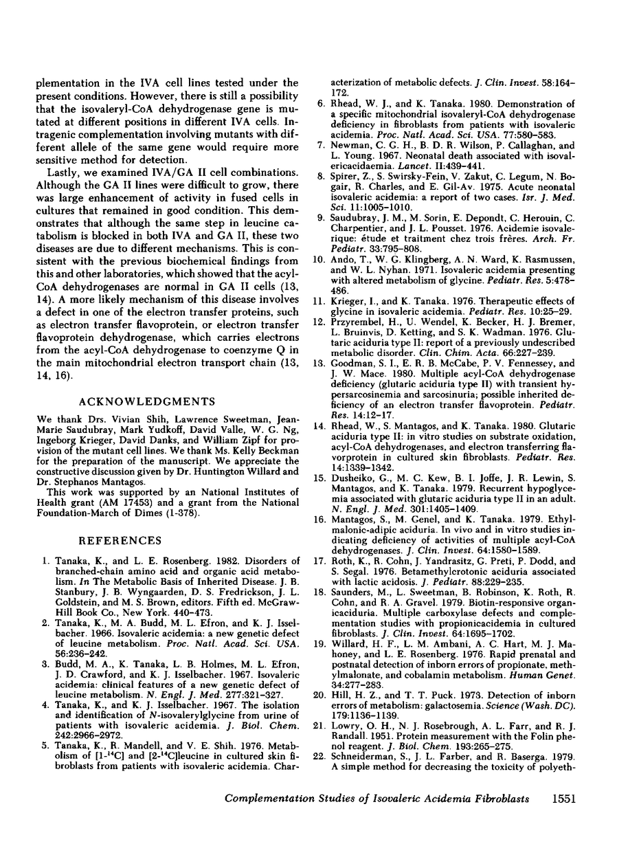 Using cultured skin fibroblasts, we studied the heterogeneity of inborn errors of leucine metabolism such as isovaleric acidemia (IVA), glutaric aciduria type II (GA II), and multiple carboxylase deficiency (MC). We first developed a simple macromolecular-labeling test to measure the ability of cells to oxidize [1-14C]isovaleric acid in situ in culture. Cells from two different lines were fused using polyethylene glycol, and the ability of the heterokaryons to oxidize [1-14C]isovaleric acid was tested by the macromolecular-labeling test. The MC line complemented with all 10 IVA lines tested; heterokaryons showed 99 +/- 68% more activity than the unfused mixture of component cells. GA II/IVA heterokaryons exhibited poor growth, but when the culture remained confluent, the GA II cells complemented with all six IVA lines tested, showing a 71 +/- 41% increase in activity. The relatively large standard deviations are due to a few experiments in which significant enhancement of macromolecular-labeling test activity was not observed upon fusion, but significant complementation was clearly observed in repeats of the same combinations. These results are consistent with our previous findings, which indicated that the decreased ability of GA II cells to oxidize isovaleryl-CoA involves a defective electron-transporting system rather than a defective isovaleryl-CoA dehydrogenase. IVA/IVA heterokaryons showed no complementation in any combination tested, indicating no detectable heterogeneity in isovaleric acidemia. This finding indicates that the same gene is mutated in all IVA lines. Previous results indicated that this gene codes for isovaleryl-CoA dehydrogenase.