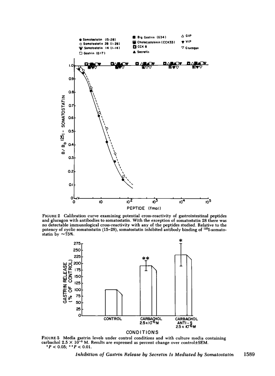 Somatostatin-containing cells have been shown to be in close anatomic proximity to gastrin-producing cells in rat antral mucosa. The present studies were directed to examine the effect of secretin on carbachol-stimulated gastrin release and to assess the potential role of somatostatin in mediating this effect. Rat antral mucosa was cultured at 37 degrees C in Krebs-Henseleit buffer, pH 7.4, gassed with 95% O2-5% CO2. After 1 h the culture medium was decanted and mucosal gastrin and somatostatin were extracted. Carbachol (2.5 X 10(-6) M) in the culture medium increased gastrin level in the medium from 14.1 +/- 2.5 to 26.9 +/- 3.0 ng/mg tissue protein (P less than 0.02), and decreased somatostatin-like immunoreactivity in the medium from 1.91 +/- 0.28 to 0.62 +/- 0.12 ng/mg (P less than 0.01) and extracted mucosal somatostatin-like immunoreactivity from 2.60 +/- 0.30 to 1.52 +/- 0.16 ng/mg (P less than 0.001). Rat antral mucosa was then cultured in the presence of secretin to determine its effect on carbachol-stimulated gastrin release. Inclusion of secretin (10(-9)-10(-7) M) inhibited significantly carbachol-stimulated gastrin release into the medium, decreasing gastrin from 26.9 +/- 3.0 to 13.6 +/- 3.2 ng/mg (10(-9) M secretin) (P less than 0.05), to 11.9 +/- 1.7 ng/mg (10(-8) secretin) (P less than 0.02), and to 10.8 +/- 4.0 ng/mg (10(-7) M secretin) (P less than 0.02). Secretin (10(-7) and 10(-8) M) also increased concomitantly culture medium somatostatin concentration. To determine whether secretion inhibition of carbachol-stimulated gastrin release was mediated by somatostatin, antral mucosa was cultured with carbachol, secretin (10(-9)-10(-7) M), and antibodies to somatostatin. Inclusion of somatostatin antibodies in the culture medium abolished the capacity of secretin (10(-7) and 10(-8) M) to inhibit carbachol-stimulated gastrin release. Results of these studies indicate (a) that secretin inhibits carbachol-stimulated gastrin release and (b) that under the conditions of these experiments secretin inhibition of gastrin release is mediated, at least in part, locally through release of antral somatostatin.