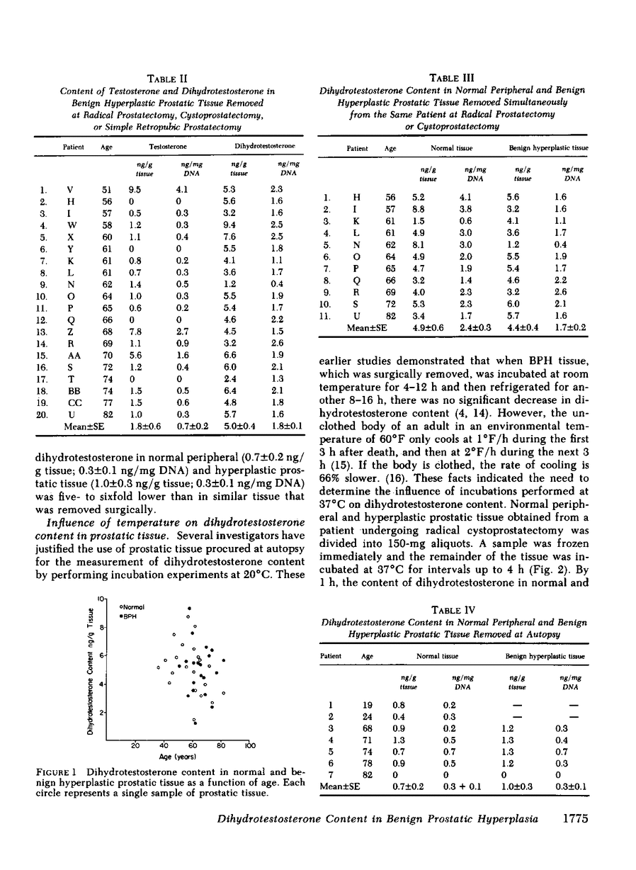 The dihydrotestosterone content of normal peripheral and benign hyperplastic prostates was measured in tissue obtained at open surgical procedures on 29 men of ages 36 to 82 yr. The dihydrotestosterone content in normal prostates (mean +/- SE, 5.1 +/- 0.4 ng/g tissue) and in benign hyperplastic prostates (5.0 +/- 0.4) was similar. In 11 patients in whom both normal and hyperplastic prostatic tissue was harvested simultaneously at the same operation, there was no significant difference in the content of dihydrotestosterone in the two types of tissue. These findings fail to confirm the widespread belief that dihydrotestosterone content is elevated in benign hyperplastic prostates. Our data differ from the reported literature in one major respect: the dihydrotestosterone content of normal peripheral prostate in this study is three to four times higher than previously reported. This difference between the present and earlier studies was resolved by experiments performed on cadavers, which were the source of normal prostatic tissue used by other investigators. Dihydrotestosterone content was measured in seven cadavers ranging in age from 19 to 82 yr of age. The results of this experiment indicate that the dihydrotestosterone content of prostatic tissue removed at autopsy is factitiously low (0.7-1.0 ng/g tissue). This finding was confirmed by in vitro incubations of fresh prostatic tissue at 37 degrees C that demonstrated reduction of dihydrotestosterone content to low levels within 2 h. When taken together, these results indicate that when prostatic tissue is harvested appropriately, the dihydrotestosterone content of normal peripheral and hyperplastic tissues is the same. This finding should influence future research into the etiology of benign prostatic hyperplasia.