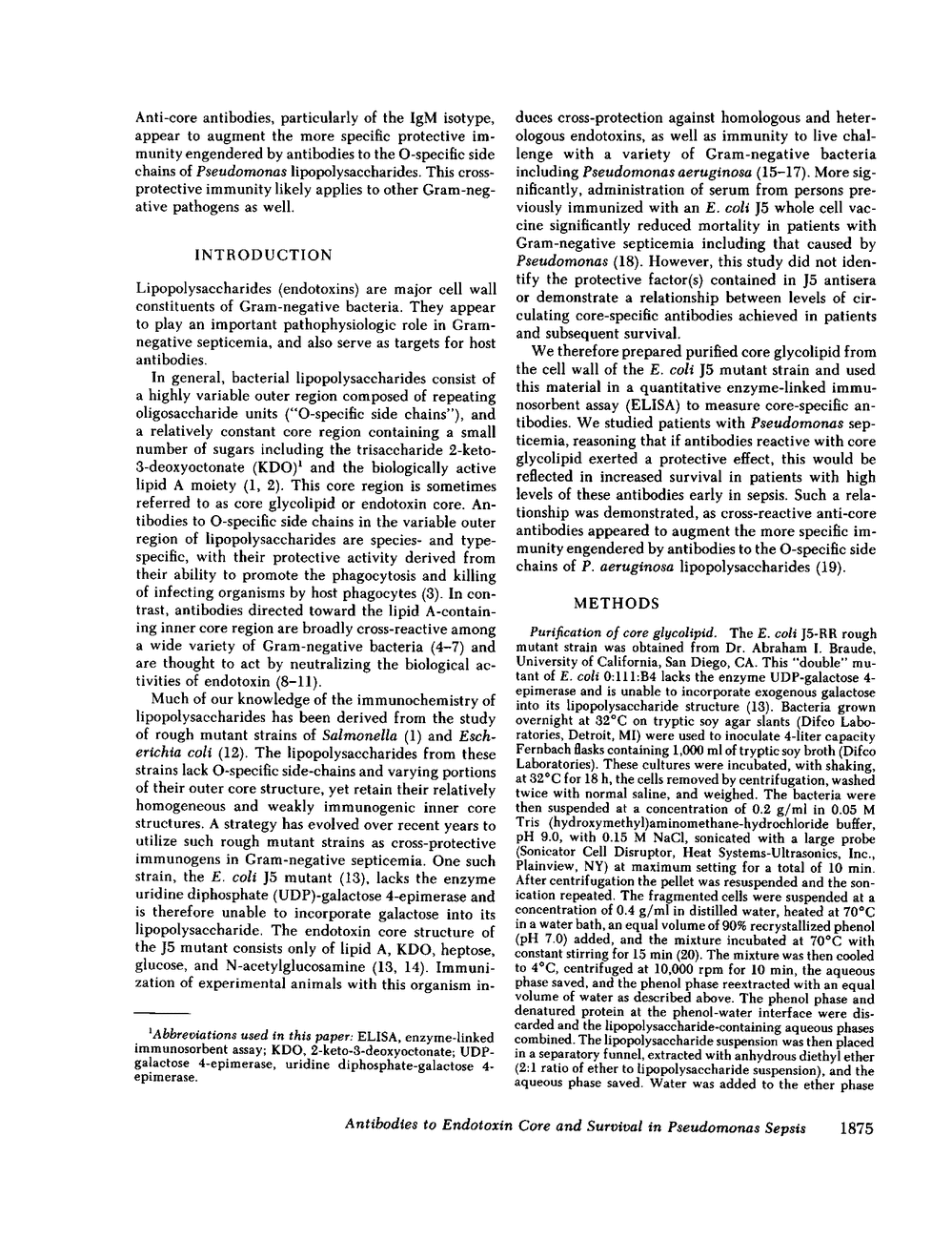 We studied the relationship between serum antibodies to the cross-reactive endotoxin core of Escherichia coli and survival following Pseudomonas aeruginosa septicemia. Core glycolipid was purified from the outer cell membrane of a uridine diphosphate galactose 4-epimerase-deficient rough mutant E. coli (J5 strain), characterized, and used as the antigen in a quantitative enzyme-linked immunosorbent assay (ELISA) to measure core-specific IgG and IgM antibodies. 43 patients with Pseudomonas septicemia, among whom there was a mortality of 42%, were evaluated. Core-specific antibody concentrations in acute sera ranged from 1 to 49 micrograms/ml in the case of IgG and from 1 to 200 micrograms/ml for IgM. Core-specific antibodies of both isotypes were higher in patients who survived compared with those who succumbed to their septicemias (mean, microgram/ml +/- SEM, 26 +/- 3 vs. 14 +/- 4, P = 0.005 for IgG, and 55 +/- 12 vs. 18 +/- 5, P = 0.009 for IgM). Although total IgG levels were also higher in acute sera from survivors compared with nonsurvivors (mean, mg/dl +/- SEM, 1,120 +/- 99 vs. 694 +/- 119, P = 0.004), total IgM levels were virtually identical in the two groups (146 +/- 23 vs. 148 +/- 48, P = 0.52). Conversely, patients with core-specific IgG levels greater than 10 micrograms/ml at the onset of septicemia had better survival than those with levels less than 10 micrograms/ml (79 vs. 14%, P less than 0.001), and patients with core-specific IgM levels greater than 30 micrograms/ml had better survival than those with levels less than 30 micrograms/ml (81 vs. 44%, P = 0.01). In comparison, patients with total IgG levels greater than 1,000 mg/dl also had better survival than those with levels less than 1,000 mg/dl (82 vs. 42%, P = 0.01), while those with total IgM levels greater than 150 mg/dl showed somewhat less improvement in survival compared with those with levels less than 150 mg/dl (71 vs. 50%, P = 0.12). Core-specific IgM was highly correlated with core-specific IgG (r = 0.52), but not with type-specific anti-lipopolysaccharide (r = 0.13) or anti-toxin A (r = 0.12) antibodies, or with total IgG (r = 0.28) or IgM (r = 0.31). In contrast, core-specific IgG correlated somewhat more closely with type-specific antibodies (r = 0.36), and with total IgG (r = 0.51) and IgM (r = 0.52). Stepwise linear discriminant analysis indicated that type-specific antibody levels were the best predictor of outcome, among those antibodies examined, followed by anti-core IgM. Although anti-core IgG, anti-toxin A, and total IgG levels all correlated individually with survival, none augmented the prognostic power of type-specific antibodies in combination with anti-core IgM, which together predicted outcome accurately 73.5% of the time. Host factors not significantly associated with anti-core antibody levels included rapidly fatal underlying disease, age, sex, leukopenia, and prior treatment with cytotoxic drugs. In contrast, prior steroid therapy was associated with low levels of both core-specific IgG and IgM (P < 0.05). These data suggest cross-protective activity against P. aeruginosa septicemia of naturally occurring antibodies to the endotoxin core of E. coli. Anti-core antibodies, particularly of the IgM isotype appear to augment the more specific protective immunity engendered by antibodies to the O-specific side chains of Pseudomonas lipopolysaccharides. This cross-protective immunity likely applies to other Gram-negative pathogens as well.