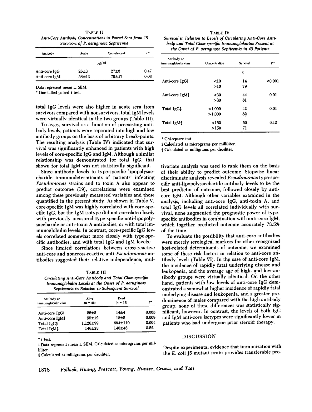 We studied the relationship between serum antibodies to the cross-reactive endotoxin core of Escherichia coli and survival following Pseudomonas aeruginosa septicemia. Core glycolipid was purified from the outer cell membrane of a uridine diphosphate galactose 4-epimerase-deficient rough mutant E. coli (J5 strain), characterized, and used as the antigen in a quantitative enzyme-linked immunosorbent assay (ELISA) to measure core-specific IgG and IgM antibodies. 43 patients with Pseudomonas septicemia, among whom there was a mortality of 42%, were evaluated. Core-specific antibody concentrations in acute sera ranged from 1 to 49 micrograms/ml in the case of IgG and from 1 to 200 micrograms/ml for IgM. Core-specific antibodies of both isotypes were higher in patients who survived compared with those who succumbed to their septicemias (mean, microgram/ml +/- SEM, 26 +/- 3 vs. 14 +/- 4, P = 0.005 for IgG, and 55 +/- 12 vs. 18 +/- 5, P = 0.009 for IgM). Although total IgG levels were also higher in acute sera from survivors compared with nonsurvivors (mean, mg/dl +/- SEM, 1,120 +/- 99 vs. 694 +/- 119, P = 0.004), total IgM levels were virtually identical in the two groups (146 +/- 23 vs. 148 +/- 48, P = 0.52). Conversely, patients with core-specific IgG levels greater than 10 micrograms/ml at the onset of septicemia had better survival than those with levels less than 10 micrograms/ml (79 vs. 14%, P less than 0.001), and patients with core-specific IgM levels greater than 30 micrograms/ml had better survival than those with levels less than 30 micrograms/ml (81 vs. 44%, P = 0.01). In comparison, patients with total IgG levels greater than 1,000 mg/dl also had better survival than those with levels less than 1,000 mg/dl (82 vs. 42%, P = 0.01), while those with total IgM levels greater than 150 mg/dl showed somewhat less improvement in survival compared with those with levels less than 150 mg/dl (71 vs. 50%, P = 0.12). Core-specific IgM was highly correlated with core-specific IgG (r = 0.52), but not with type-specific anti-lipopolysaccharide (r = 0.13) or anti-toxin A (r = 0.12) antibodies, or with total IgG (r = 0.28) or IgM (r = 0.31). In contrast, core-specific IgG correlated somewhat more closely with type-specific antibodies (r = 0.36), and with total IgG (r = 0.51) and IgM (r = 0.52). Stepwise linear discriminant analysis indicated that type-specific antibody levels were the best predictor of outcome, among those antibodies examined, followed by anti-core IgM. Although anti-core IgG, anti-toxin A, and total IgG levels all correlated individually with survival, none augmented the prognostic power of type-specific antibodies in combination with anti-core IgM, which together predicted outcome accurately 73.5% of the time. Host factors not significantly associated with anti-core antibody levels included rapidly fatal underlying disease, age, sex, leukopenia, and prior treatment with cytotoxic drugs. In contrast, prior steroid therapy was associated with low levels of both core-specific IgG and IgM (P < 0.05). These data suggest cross-protective activity against P. aeruginosa septicemia of naturally occurring antibodies to the endotoxin core of E. coli. Anti-core antibodies, particularly of the IgM isotype appear to augment the more specific protective immunity engendered by antibodies to the O-specific side chains of Pseudomonas lipopolysaccharides. This cross-protective immunity likely applies to other Gram-negative pathogens as well.