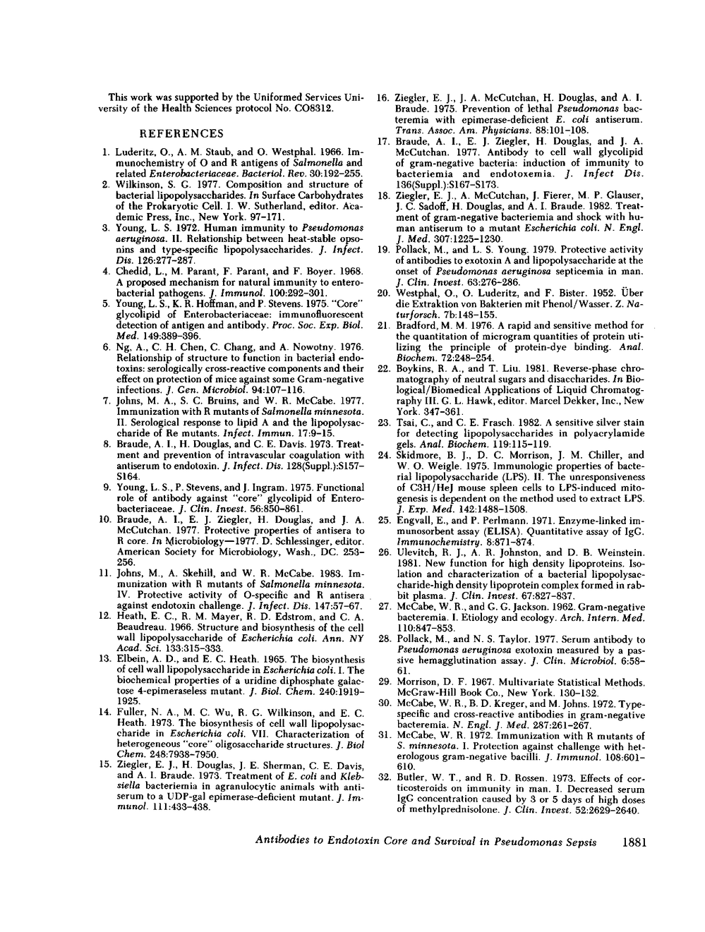 We studied the relationship between serum antibodies to the cross-reactive endotoxin core of Escherichia coli and survival following Pseudomonas aeruginosa septicemia. Core glycolipid was purified from the outer cell membrane of a uridine diphosphate galactose 4-epimerase-deficient rough mutant E. coli (J5 strain), characterized, and used as the antigen in a quantitative enzyme-linked immunosorbent assay (ELISA) to measure core-specific IgG and IgM antibodies. 43 patients with Pseudomonas septicemia, among whom there was a mortality of 42%, were evaluated. Core-specific antibody concentrations in acute sera ranged from 1 to 49 micrograms/ml in the case of IgG and from 1 to 200 micrograms/ml for IgM. Core-specific antibodies of both isotypes were higher in patients who survived compared with those who succumbed to their septicemias (mean, microgram/ml +/- SEM, 26 +/- 3 vs. 14 +/- 4, P = 0.005 for IgG, and 55 +/- 12 vs. 18 +/- 5, P = 0.009 for IgM). Although total IgG levels were also higher in acute sera from survivors compared with nonsurvivors (mean, mg/dl +/- SEM, 1,120 +/- 99 vs. 694 +/- 119, P = 0.004), total IgM levels were virtually identical in the two groups (146 +/- 23 vs. 148 +/- 48, P = 0.52). Conversely, patients with core-specific IgG levels greater than 10 micrograms/ml at the onset of septicemia had better survival than those with levels less than 10 micrograms/ml (79 vs. 14%, P less than 0.001), and patients with core-specific IgM levels greater than 30 micrograms/ml had better survival than those with levels less than 30 micrograms/ml (81 vs. 44%, P = 0.01). In comparison, patients with total IgG levels greater than 1,000 mg/dl also had better survival than those with levels less than 1,000 mg/dl (82 vs. 42%, P = 0.01), while those with total IgM levels greater than 150 mg/dl showed somewhat less improvement in survival compared with those with levels less than 150 mg/dl (71 vs. 50%, P = 0.12). Core-specific IgM was highly correlated with core-specific IgG (r = 0.52), but not with type-specific anti-lipopolysaccharide (r = 0.13) or anti-toxin A (r = 0.12) antibodies, or with total IgG (r = 0.28) or IgM (r = 0.31). In contrast, core-specific IgG correlated somewhat more closely with type-specific antibodies (r = 0.36), and with total IgG (r = 0.51) and IgM (r = 0.52). Stepwise linear discriminant analysis indicated that type-specific antibody levels were the best predictor of outcome, among those antibodies examined, followed by anti-core IgM. Although anti-core IgG, anti-toxin A, and total IgG levels all correlated individually with survival, none augmented the prognostic power of type-specific antibodies in combination with anti-core IgM, which together predicted outcome accurately 73.5% of the time. Host factors not significantly associated with anti-core antibody levels included rapidly fatal underlying disease, age, sex, leukopenia, and prior treatment with cytotoxic drugs. In contrast, prior steroid therapy was associated with low levels of both core-specific IgG and IgM (P < 0.05). These data suggest cross-protective activity against P. aeruginosa septicemia of naturally occurring antibodies to the endotoxin core of E. coli. Anti-core antibodies, particularly of the IgM isotype appear to augment the more specific protective immunity engendered by antibodies to the O-specific side chains of Pseudomonas lipopolysaccharides. This cross-protective immunity likely applies to other Gram-negative pathogens as well.