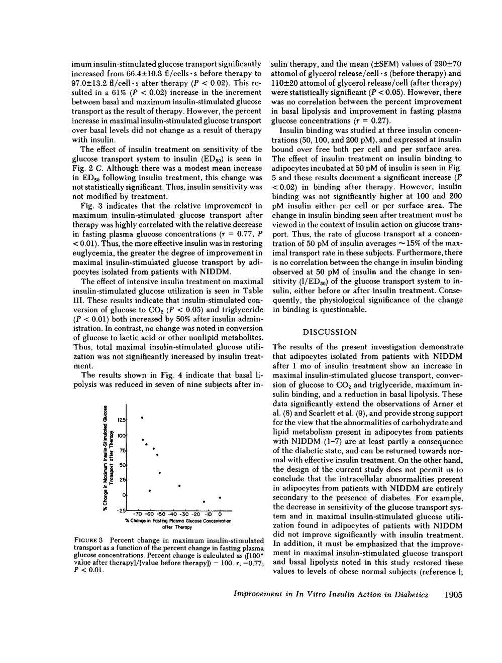 It has been previously reported that maximum insulin-stimulated glucose transport and utilization were both decreased, while basal lipolysis was increased in adipocytes from obese subjects with noninsulin-dependent diabetes mellitus (NIDDM). To determine whether these values can be returned towards those obtained in equally obese subjects with normal glucose tolerance, these measures of adipocyte metabolism were quantified in 10 NIDDM subjects before and after control of hyperglycemia with insulin. The results demonstrate that maximum insulin-stimulated glucose transport (P less than 0.02) and glucose incorporation into triglyceride (P less than 0.01) and CO2 (P less than 0.05) (at 5.5 mM glucose) increased and basal lipolysis decreased (P less than 0.05) after 4 wk of insulin treatment. In contrast, glucose incorporation into lactate and other glycolytic metabolites (at 5.5 mM glucose), and sensitivity of glucose transport to insulin, did not improve with insulin therapy. The latter occurred despite an increase in insulin binding (P less than 0.01). Finally, the improvement in maximal insulin-stimulated glucose transport correlated with the fall in fasting hyperglycemia (r = 0.77, P less than 0.01). These findings demonstrate that several of the abnormalities of carbohydrate and lipid metabolism recently noted to be present in adipocytes from patients with NIDDM can be shown to significantly improve with insulin treatment.
