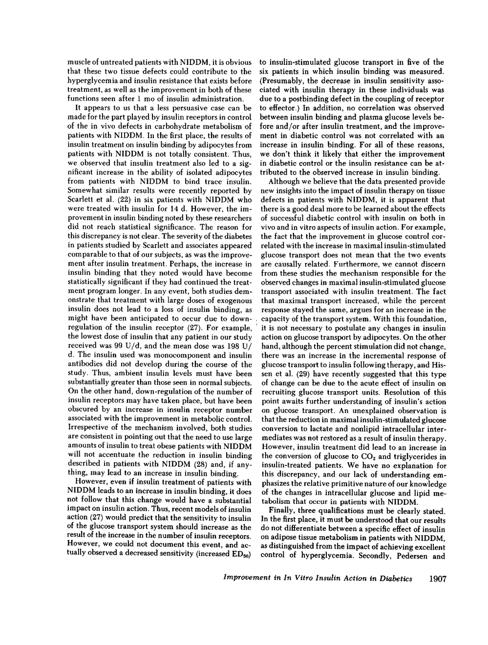 It has been previously reported that maximum insulin-stimulated glucose transport and utilization were both decreased, while basal lipolysis was increased in adipocytes from obese subjects with noninsulin-dependent diabetes mellitus (NIDDM). To determine whether these values can be returned towards those obtained in equally obese subjects with normal glucose tolerance, these measures of adipocyte metabolism were quantified in 10 NIDDM subjects before and after control of hyperglycemia with insulin. The results demonstrate that maximum insulin-stimulated glucose transport (P less than 0.02) and glucose incorporation into triglyceride (P less than 0.01) and CO2 (P less than 0.05) (at 5.5 mM glucose) increased and basal lipolysis decreased (P less than 0.05) after 4 wk of insulin treatment. In contrast, glucose incorporation into lactate and other glycolytic metabolites (at 5.5 mM glucose), and sensitivity of glucose transport to insulin, did not improve with insulin therapy. The latter occurred despite an increase in insulin binding (P less than 0.01). Finally, the improvement in maximal insulin-stimulated glucose transport correlated with the fall in fasting hyperglycemia (r = 0.77, P less than 0.01). These findings demonstrate that several of the abnormalities of carbohydrate and lipid metabolism recently noted to be present in adipocytes from patients with NIDDM can be shown to significantly improve with insulin treatment.
