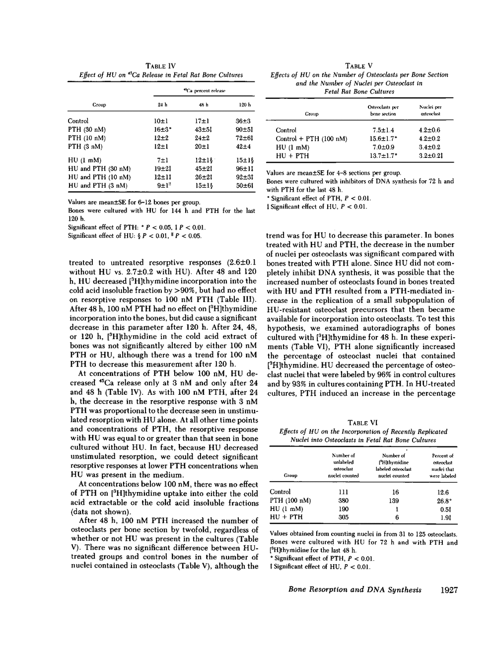Osteoclasts, the principal cells mediating bone resorption, are believed to increase their size, number, and resorbing activity in response to parathyroid hormone (PTH) through mechanisms dependent upon the fusion of specific mononuclear precursor cells into either new or existing multinucleated osteoclasts. To address the question of whether these actions of PTH are dependent on the replication of osteoclast precursor cells, we examined the ability of an inhibitor of DNA synthesis, hydroxyurea (HU), to alter bone resorption, osteoclast formation, and DNA synthesis in cultured fetal rat bones treated with PTH. We found that HU significantly reduced [3H]thymidine incorporation into the bones and labeling of osteoclast nuclei by greater than 90%, but did not prevent PTH from stimulating bone resorption, measured as the release of 45Ca, or from increasing the number of osteoclasts in the bones. In bones cultured without PTH, HU decreased the rate of bone resorption, but not the number of osteoclasts per bone. We conclude that in fetal rat bone cultures, PTH can increase osteoclast number and stimulate bone resorption by affecting existing osteoclasts and osteoclast precursors, and that replication of osteoclast precursor cells is not necessary for PTH to stimulate a resorptive response. In unstimulated cultures it appears that HU inhibits bone resorption by affecting mechanisms that are independent of changes in osteoclast number and that may be influenced by cell replication or other unknown factors.