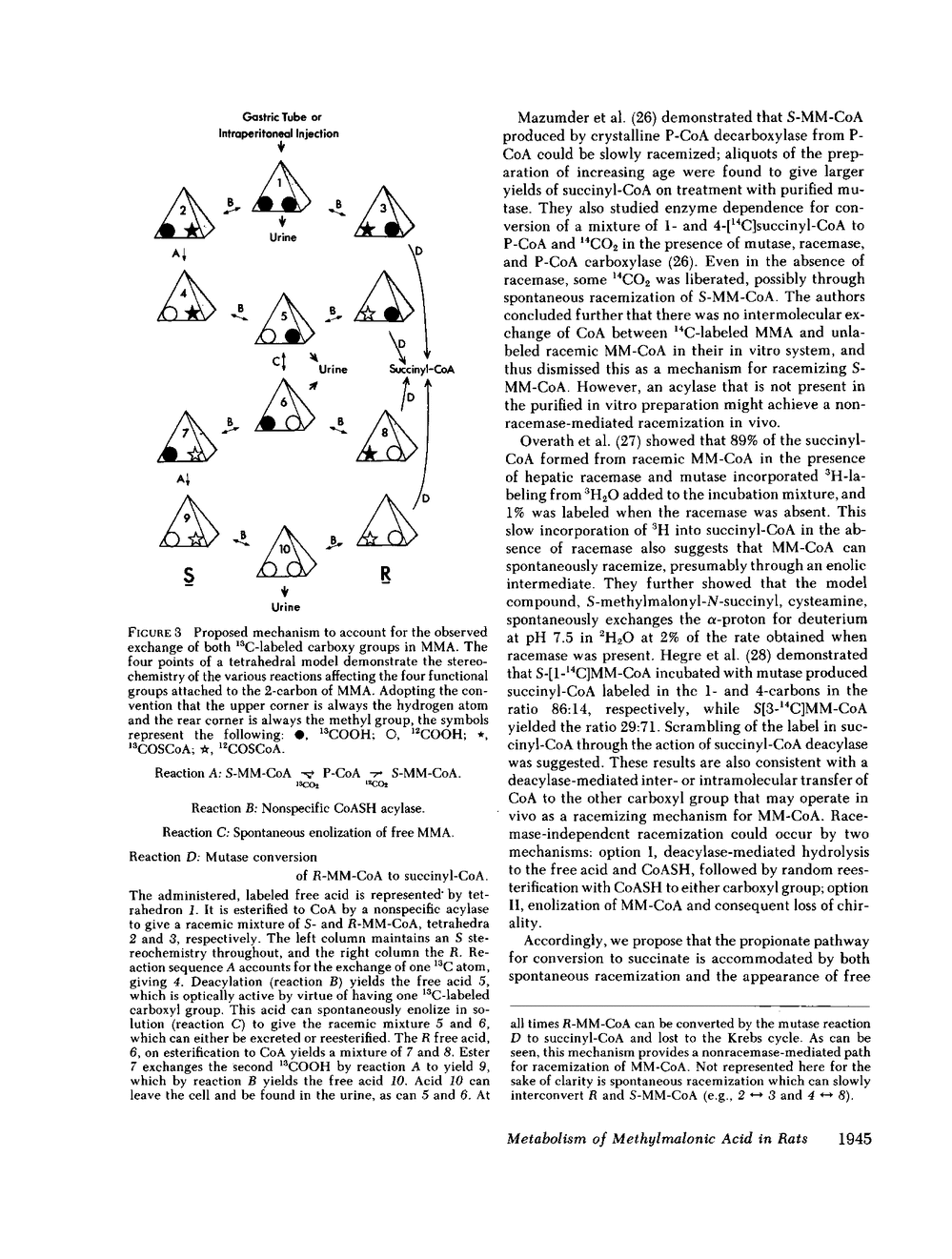 Vitamin B12-deficient and normal rats were loaded with methylmalonic (MMA) and ethylmalonic acids labeled with 13C in the carboxyl groups and with 2H in the alkyl groups. Significant fractions of the administered acids were excreted in both the B12-deficient and the normal animal, having undergone exchange of both their 13C-labeled carboxyl groups with endogenous 12C. The exchange of the alpha-1H of MMA in 2H2O at 25 degrees C and pH 7.5 was found by 1H-nuclear magnetic resonance to have a half-life of 28.3 min. These results show that a fraction of in vivo metabolism through the propionate-to-succinate pathway occurs via a shunt involving free MMA. The enzymes of this pathway are thought to utilize only coenzyme A (CoA) esters. To allow for the exchange of the second CoA-bound carboxyl group, we propose the deacylation of the once exchanged acid with spontaneous racemization (relative to the 13C-carboxyl group), followed by reacylation, thus exposing the labeled carboxyl to decarboxylation. The significance of this mechanism involving free MMA is that racemization of methylmalonyl (MM)-CoA may also occur without the intervention of MM-CoA racemase. A deficiency of this enzyme need not result in symptomatic methylmalonic aciduria.