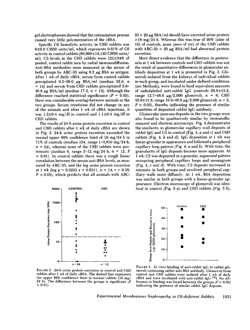 Our recent observations of a complement-mediated, cell-independent mechanism of altered glomerular permeability in rat membranous nephropathy suggested a possible role for the terminal complement pathway in the mediation of proteinuria in certain forms of glomerular disease. To directly determine whether the membranolytic terminal complement components (C5b-C9) are involved in glomerular injury, we studied the development of proteinuria in normal and C6-deficient (C6D) rabbits, in both of which a membranous nephropathy-like lesion develops early in the course of immunization with cationized bovine serum albumin (cBSA) (pI 8.9-9.2). C6 hemolytic activity of C6D was 0.01% that of control rabbits. After 1 wk of daily intravenous injections of cBSA, proteinuria developed in 71% of controls (median 154, range 1-3,010 mg/24 h, n = 24), whereas none of C6D were proteinuric (median 6, range 2-12 mg/24 h, n = 12, P less than 0.01). After 1 wk of cBSA, both groups had qualitatively identical glomerular deposits of BSA, rabbit IgG, and C3 on immunofluorescence microscopy, predominantly subepithelial electron-dense deposits on electron microscopy, and minimal glomerular inflammatory cell infiltration of glomeruli. Glomeruli were isolated from individual animals after 1 wk of cBSA and deposits of rabbit IgG antibody were quantitated by a standardized in vitro assay using anti-rabbit IgG-125I. Rabbit IgG deposits were found to be similar in control (29.8 +/- 13.2, range 12.7-48.6 micrograms anti-IgG/2,000 glomeruli, n = 6) and C6D rabbits (32.6 +/- 13.8, range 16.8-48.8 micrograms anti-IgG/2,000 glomeruli, n = 5, P greater than 0.05). After 2 wk, coincident with a prominent influx of mononuclear cells and neutrophils, proteinuria developed in C6D rabbits. These results document, for the first time, a requirement for a terminal complement component in the development of immunologic glomerular injury. Since the only known action of C6 is in the assembly of the membrane attack complex, these observations suggest that the membranolytic properties of complement may contribute to glomerular damage.
