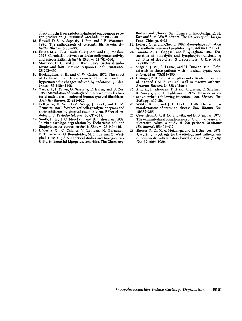 The present studies demonstrate that bacterial lipopolysaccharides (LPS) induce cartilage matrix degradation in live explants in organ culture. Quintuplicate bovine nasal fibrocartilage explants cultured for 8 d with three different purified LPS preparations derived from Escherichia coli and Salmonella typhosa at concentrations ranging from 1.0 to 25.0 micrograms/ml resulted in matrix proteoglycan depletion of 33.3 +/- 5.8 to 92.5 +/- 2.0% (medium control depletion 17.7 +/- 0.7 to 32.4 +/- 1.4%). Matrix degradation depended on the presence of live chondrocytes because frozen-thawed explants incubated with LPS failed to show any proteoglycan release. Moreover, the addition of Polymyxin B (25 micrograms/ml) to live explants incubated with LPS abolished matrix release, whereas Polymyxin B had no effect on the matrix-degrading activity provided by blood mononuclear cell factors. A highly purified Lipid A preparation induced matrix degradation at a concentration of 0.01 micrograms/ml. Cartilage matrix collagen and proteoglycan depletion also occurred with porcine articular cartilage explants (collagen release: 18.3 +/- 3.5%, medium control: 2.1 +/- 0.5%; proteoglycan release: 79.0 +/- 5.9%, medium control: 28.8 +/- 4.8%). Histochemical analysis of the cultured explants confirmed the results described above. Gel chromatography of the proteoglycans released in culture indicated that LPS induced significant degradation of the high molecular weight chondroitin sulfate-containing aggregates. These findings suggest that bacterial products may induce cartilage damage by direct stimulation of chondrocytes. This pathogenic mechanism may play a role in joint damage in septic arthritis and in arthropathies resulting from the presence of bacterial products derived from the gastrointestinal tract.
