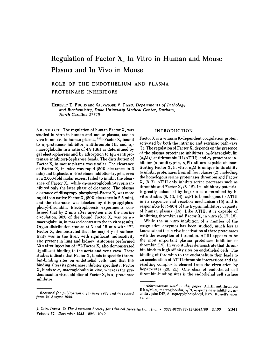 The regulation of human Factor Xa was studied in vitro in human and mouse plasma, and in vivo in mouse. In human plasma, 125I-Factor Xa bound to alpha 1-proteinase inhibitor, antithrombin III, and alpha 2-macroglobulin in a ratio of 4.9:1.9:1 as determined by gel electrophoresis and by adsorption to IgG-(antiproteinase inhibitor)-Sepharose beads. The distribution of Factor Xa in mouse plasma was similar. The clearance of Factor Xa in mice was rapid (50% clearance in 3 min) and biphasic. alpha 1-Proteinase inhibitor-trypsin, even at a 2,000-fold molar excess, failed to inhibit the clearance of Factor Xa, while alpha 2-macroglobulin-trypsin inhibited only the later phase of clearance. The plasma clearance of diisopropylphosphoryl-Factor Xa was more rapid than native Factor Xa (50% clearance in 2.5 min), and the clearance was blocked by diisopropylphosphoryl-thrombin. Electrophoresis experiments confirmed that by 2 min after injection into the murine circulation, 90% of the bound Factor Xa was on alpha 2-macroglobulin, in marked contrast to the in vitro results. Organ distribution studies at 3 and 15 min with 125I-Factor Xa demonstrated that the majority of radioactivity was in the liver, with significant radioactivity also present in lung and kidney. Autopsies performed 30 s after injection of 125I-Factor Xa also demonstrated significant binding to the aorta and vena cava. These studies indicate that Factor Xa binds to specific thrombin-binding sites on endothelial cells, and that this binding alters its proteinase inhibitor specificity. Factor Xa binds to alpha 2-macroglobulin in vivo, whereas the predominant in vitro inhibitor of Factor Xa is alpha 1-proteinase inhibitor.