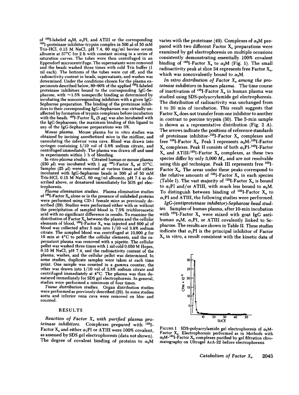 The regulation of human Factor Xa was studied in vitro in human and mouse plasma, and in vivo in mouse. In human plasma, 125I-Factor Xa bound to alpha 1-proteinase inhibitor, antithrombin III, and alpha 2-macroglobulin in a ratio of 4.9:1.9:1 as determined by gel electrophoresis and by adsorption to IgG-(antiproteinase inhibitor)-Sepharose beads. The distribution of Factor Xa in mouse plasma was similar. The clearance of Factor Xa in mice was rapid (50% clearance in 3 min) and biphasic. alpha 1-Proteinase inhibitor-trypsin, even at a 2,000-fold molar excess, failed to inhibit the clearance of Factor Xa, while alpha 2-macroglobulin-trypsin inhibited only the later phase of clearance. The plasma clearance of diisopropylphosphoryl-Factor Xa was more rapid than native Factor Xa (50% clearance in 2.5 min), and the clearance was blocked by diisopropylphosphoryl-thrombin. Electrophoresis experiments confirmed that by 2 min after injection into the murine circulation, 90% of the bound Factor Xa was on alpha 2-macroglobulin, in marked contrast to the in vitro results. Organ distribution studies at 3 and 15 min with 125I-Factor Xa demonstrated that the majority of radioactivity was in the liver, with significant radioactivity also present in lung and kidney. Autopsies performed 30 s after injection of 125I-Factor Xa also demonstrated significant binding to the aorta and vena cava. These studies indicate that Factor Xa binds to specific thrombin-binding sites on endothelial cells, and that this binding alters its proteinase inhibitor specificity. Factor Xa binds to alpha 2-macroglobulin in vivo, whereas the predominant in vitro inhibitor of Factor Xa is alpha 1-proteinase inhibitor.