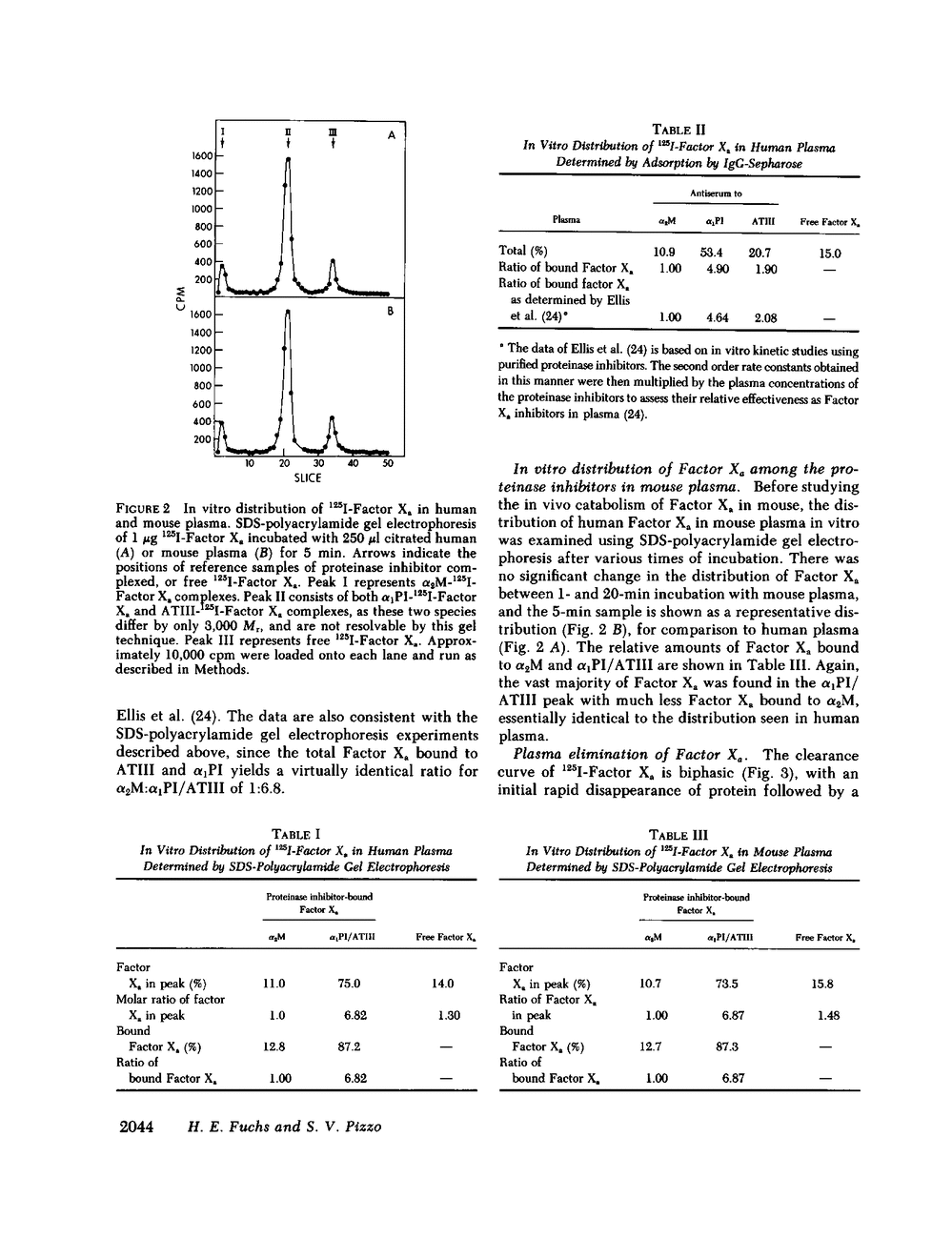 The regulation of human Factor Xa was studied in vitro in human and mouse plasma, and in vivo in mouse. In human plasma, 125I-Factor Xa bound to alpha 1-proteinase inhibitor, antithrombin III, and alpha 2-macroglobulin in a ratio of 4.9:1.9:1 as determined by gel electrophoresis and by adsorption to IgG-(antiproteinase inhibitor)-Sepharose beads. The distribution of Factor Xa in mouse plasma was similar. The clearance of Factor Xa in mice was rapid (50% clearance in 3 min) and biphasic. alpha 1-Proteinase inhibitor-trypsin, even at a 2,000-fold molar excess, failed to inhibit the clearance of Factor Xa, while alpha 2-macroglobulin-trypsin inhibited only the later phase of clearance. The plasma clearance of diisopropylphosphoryl-Factor Xa was more rapid than native Factor Xa (50% clearance in 2.5 min), and the clearance was blocked by diisopropylphosphoryl-thrombin. Electrophoresis experiments confirmed that by 2 min after injection into the murine circulation, 90% of the bound Factor Xa was on alpha 2-macroglobulin, in marked contrast to the in vitro results. Organ distribution studies at 3 and 15 min with 125I-Factor Xa demonstrated that the majority of radioactivity was in the liver, with significant radioactivity also present in lung and kidney. Autopsies performed 30 s after injection of 125I-Factor Xa also demonstrated significant binding to the aorta and vena cava. These studies indicate that Factor Xa binds to specific thrombin-binding sites on endothelial cells, and that this binding alters its proteinase inhibitor specificity. Factor Xa binds to alpha 2-macroglobulin in vivo, whereas the predominant in vitro inhibitor of Factor Xa is alpha 1-proteinase inhibitor.