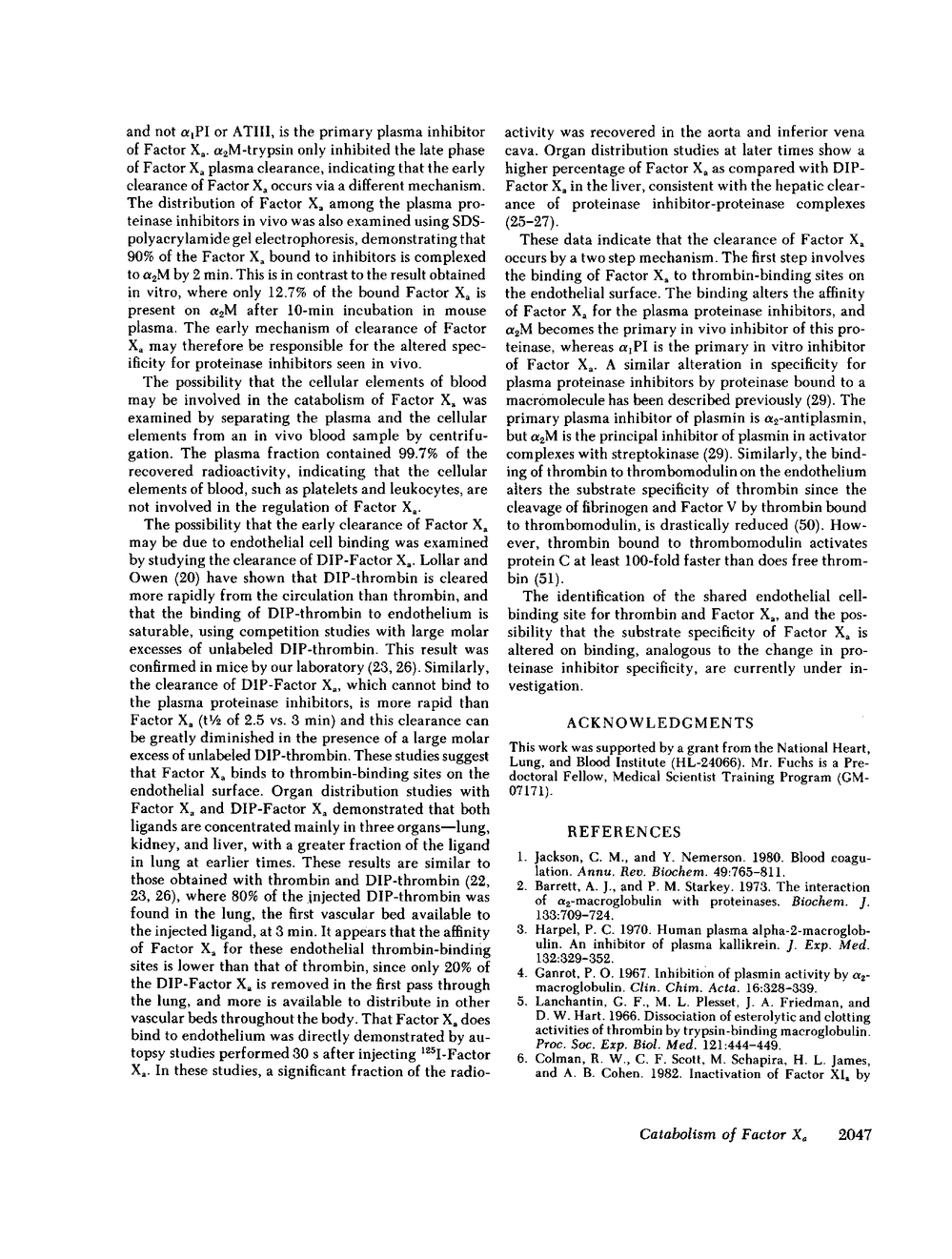 The regulation of human Factor Xa was studied in vitro in human and mouse plasma, and in vivo in mouse. In human plasma, 125I-Factor Xa bound to alpha 1-proteinase inhibitor, antithrombin III, and alpha 2-macroglobulin in a ratio of 4.9:1.9:1 as determined by gel electrophoresis and by adsorption to IgG-(antiproteinase inhibitor)-Sepharose beads. The distribution of Factor Xa in mouse plasma was similar. The clearance of Factor Xa in mice was rapid (50% clearance in 3 min) and biphasic. alpha 1-Proteinase inhibitor-trypsin, even at a 2,000-fold molar excess, failed to inhibit the clearance of Factor Xa, while alpha 2-macroglobulin-trypsin inhibited only the later phase of clearance. The plasma clearance of diisopropylphosphoryl-Factor Xa was more rapid than native Factor Xa (50% clearance in 2.5 min), and the clearance was blocked by diisopropylphosphoryl-thrombin. Electrophoresis experiments confirmed that by 2 min after injection into the murine circulation, 90% of the bound Factor Xa was on alpha 2-macroglobulin, in marked contrast to the in vitro results. Organ distribution studies at 3 and 15 min with 125I-Factor Xa demonstrated that the majority of radioactivity was in the liver, with significant radioactivity also present in lung and kidney. Autopsies performed 30 s after injection of 125I-Factor Xa also demonstrated significant binding to the aorta and vena cava. These studies indicate that Factor Xa binds to specific thrombin-binding sites on endothelial cells, and that this binding alters its proteinase inhibitor specificity. Factor Xa binds to alpha 2-macroglobulin in vivo, whereas the predominant in vitro inhibitor of Factor Xa is alpha 1-proteinase inhibitor.