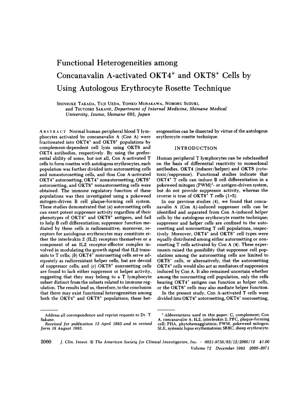 Normal human peripheral blood T lymphocytes activated by concanavalin A (Con A) were fractionated into OKT4+ and OKT8+ populations by complement-dependent cell lysis using OKT8 and OKT4 antibodies, respectively. By using the preferential ability of some, but not all, Con A-activated T cells to form rosettes with autologous erythrocytes, each population was further divided into autorosetting cells and nonautorosetting cells, and thus Con A-activated OKT4+ autorosetting, OKT4+ nonautorosetting, OKT8+ autorosetting, and OKT8+ nonautorosetting cells were obtained. The immune regulatory function of these populations was then investigated using a pokeweed mitogen-driven B cell plaque-forming cell system. These studies demonstrated that (a) autorosetting cells can exert potent suppressor activity regardless of their phenotypes of OKT4+ and OKT8+ antigens, and fail to help B cell differentiation; suppressor function mediated by these cells is radiosensitive; moreover, receptors for autologous erythrocytes may constitute either the interleukin 2 (IL2) receptors themselves or a component of an IL2 receptor-effector complex involved in modulating the growth signal that IL2 transmits to T cells; (b) OKT4+ nonrosetting cells serve adequately as radioresistant helper cells, but are devoid of suppressor cells; and (c) OKT8+ nonrosetting cells are found to lack either suppressor or helper activity, suggesting that they may belong to a T lymphocyte subset distinct from the subsets related to immune regulation. The results lead us, therefore, to the conclusion that there may exist functional heterogeneities among both the OKT4+ and OKT8+ populations; these heterogeneities can be dissected by virtue of the autologous erythrocyte rosette technique.