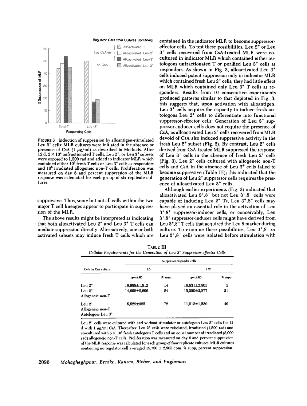 To probe the mechanism of suppressor T cell generation in man, we have carried out mixed leukocyte reactions (MLR) in the presence of cyclosporin (CsA), a fungal metabolite which prevents the generation of cytotoxic lymphocytes while permitting activation of suppressor cells. After a 12-d MLR in the presence of 1 microgram/ml CsA, T cells were fractionated into subsets with monoclonal antibodies, and each subset was tested for the ability to inhibit a second fresh MLR that is devoid of CsA. The results show that Leu 2+ T cells derived from the first culture suppress the second MLR in an HLA-DR antigen-specific manner and in the absence of detectable lysis of stimulator cells. However, Leu 2+ cells do not develop into suppressor cells unless acted upon by alloantigen-primed Leu 3+ inducer cells. Furthermore, only those Leu 3+ cells that also express the Leu 8 marker (Leu 3+, 8+) are capable of inducing suppressor cells. Thus, antigen-specific feedback inhibition of an immune response in man results from an ordered series of interactions between T cells of distinct phenotype.