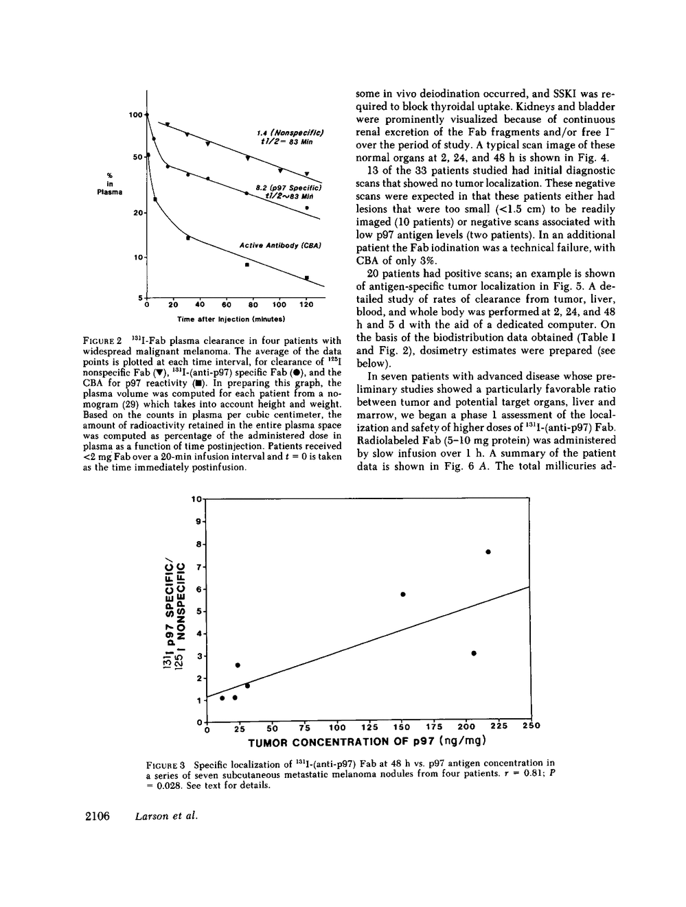 33 patients with advanced malignant melanoma were studied after intravenous administration of 131I-labeled Fab fragments specific for p97, an oncofetal glycoprotein of human melanoma. In all, 47 gamma camera imaging studies were performed for the purpose of localization of metastatic deposits. In addition to tumor, 131I-Fab uptake was also seen in liver and kidney. 20 of these studies included simultaneous administration of both an 131I-labeled Fab specific for p97, and an 125I-labeled Fab not specific for p97. Blood clearance of p97-specific Fab was significantly more rapid than for nonspecific Fab. Eight of these patients had biopsies of subcutaneous nodules at 48 and 72 h postinjection in order to assess whether localization of radioactivity was antigen specific. Antigen-specific localization was observed with average ratios of specific/nonspecific uptake of 3.7 (48 h) and 3.4 (72 h); uptake was strongly correlated with tumor p97 concentration (r = 0.81, P less than 0.01). Also, imaging studies of the bio-distribution of 131I-labeled anti-p97 Fab in patients selected for high p97 tumor concentration showed avid tumor uptake and more prolonged retention of labeled Fab in tumor than in normal tissues. Based on these studies, we estimated that total 131I doses of 500 mCi could be safely given to patients before dose-limiting toxicity would be observed. Accordingly, in seven selected patients, phase I radiotherapeutic trials were begun. For improved radiation safety, we developed automated methods to label Fab fragments with up to 200 mCi of 131I. So far, a total of 12 individual therapeutic doses, ranging from 34 to 197 mCi of 131I-labeled to 5 to 10 mg of Fab, have been administered with excellent tumor localization and without major target organ toxicity. Cumulative doses ranged from 132 to 529 mCi 131I. Side effects attributable to the radiation were mild, with a transient drop slightly greater than 50% in platelet and absolute neutrophil counts being observed in the two patients who received cumulative doses greater than 500 mCi. In the combined series of 47 diagnostic and 12 therapeutic studies, four acute reactions were observed: one episode each of transient chills and fever; flushing and hypotension; and two skin rashes. All of these reactions responded promptly to symptomatic therapy. After multiple administrations of 131I-(anti-p97) Fab (IgG1), isotype-specific immunity was observed in three patients. In two of these patients it was possible to successfully reinfuse after immunity had developed with 131I-(anti-p97) Fab of a different isotype (IgG2a).Dosimetry estimates were performed based on the biodistribution of (131)I-Fab in these patients,and for every 100 mCi of (131)I-Fab given, tumor receives 1,040 rads; liver. 325 rads; and bone marrow, 30 rads. Marrow would be expected to be the critical organ, if doses >500 mCi (131)I-Fab are given. These studies demonstrated that, with proper precautions, large doses (of an (131)I-labeled murine Fab fragments immunologically specific for a human melanoma-associated antigen) could be safely given to humans by using repetitive intravenous injections.