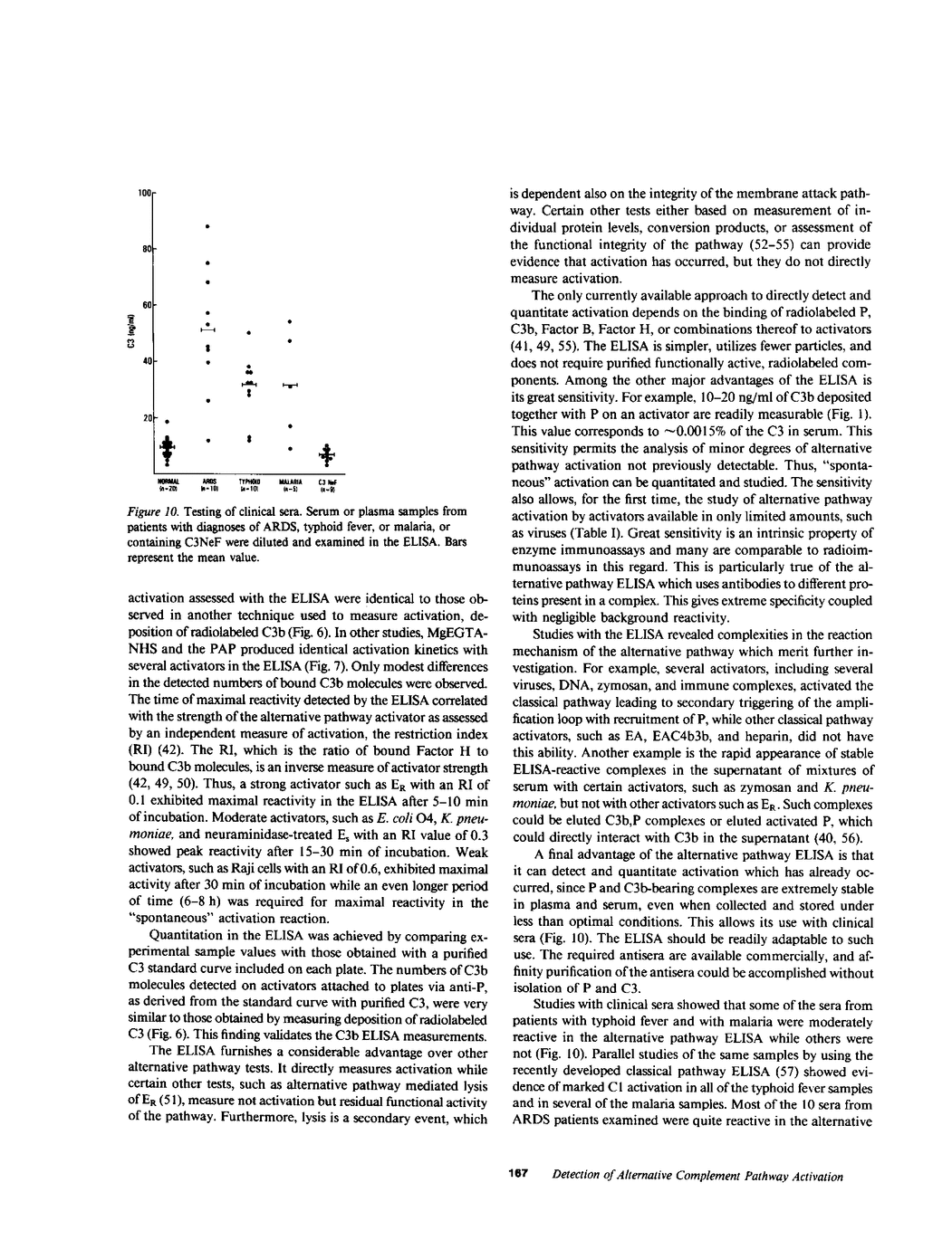 We have developed a new, specific, and highly sensitive enzyme-linked immunosorbent assay (ELISA) which quantitates activation of the alternative pathway in human serum, plasma, or on the surface of activators. The ELISA detects the third component of complement (C3b), proteolytic fragment of complement Factor B (Bb), and properdin (P) complex or its derivative product, C3b,P. In the method, activator-plasma mixtures, plasma containing an activated alternative pathway, or other samples are added to the wells of microtitration plates precoated with antibody to P. C3b, Bb,P or C3b,P complexes which become bound are quantitated by subsequently added, enzyme-labeled, anti-C3. The resulting hydrolysis of the chromogenic substrate is expressed as nanograms of C3b by reference to a C3 standard curve. In addition to absolute specificity for activation of the pathway because of the nature of the complex detected by the assay, the ELISA is highly sensitive and able to reproducibly detect 10-20 ng/ml of C3b,P complexes in serum. This value corresponds to 0.0015% of the C3 in serum. In a series of studies to validate the parameters of the ELISA, reactivity was found to be dependent on the presence of alternative pathway proteins, the functional integrity of the pathway, and on the presence of magnesium. Sheep erythrocytes were converted to activators by treatment with neuraminidase. By using a variety of activators, the kinetics of activation and the numbers of bound C3b molecules quantitated by the ELISA were very similar to those measured by C3b deposition. The ELISA also detected identical activation kinetics when MgEGTA-serum and a mixture of the purified alternative pathway proteins were used as sources of the pathway. ELISA reaction kinetics also correlated with the restriction index, a measure of alternative pathway-activating ability. These studies cumulatively validate the ELISA as a direct and quantitative assay for alternative pathway activation. The sensitivity of the ELISA has permitted its use to detect direct alternative pathway activation by several viruses. The ELISA has also shown that certain classical pathway activators trigger the amplification loop of the alternative pathway while others do not. In addition, stable ELISA reactive complexes appeared in the supernatant of mixtures of serum with certain, but not other activators. The ability of the ELISA to detect activation which has already occurred and the stability of the reactive complexes permits studies of clinical sera. Normal human sera (20) contained low levels (5-20 ng/ml) of ELISA-reactive complexes. A proportion of sera from individuals with the adult respiratory distress syndrome (9-10), typhoid fever (8-10), malaria (3-5), gram-negative sepsis (9 of 47), acute trauma and shock (6 f 25), and systemic lupus erythematosus (3 of 29) showed elevated levels of complexes reactive in the alternative pathway ELISA. In contrast, nine sera from patients with circulating C3 nephritic factor were not reactive in the ELISA.