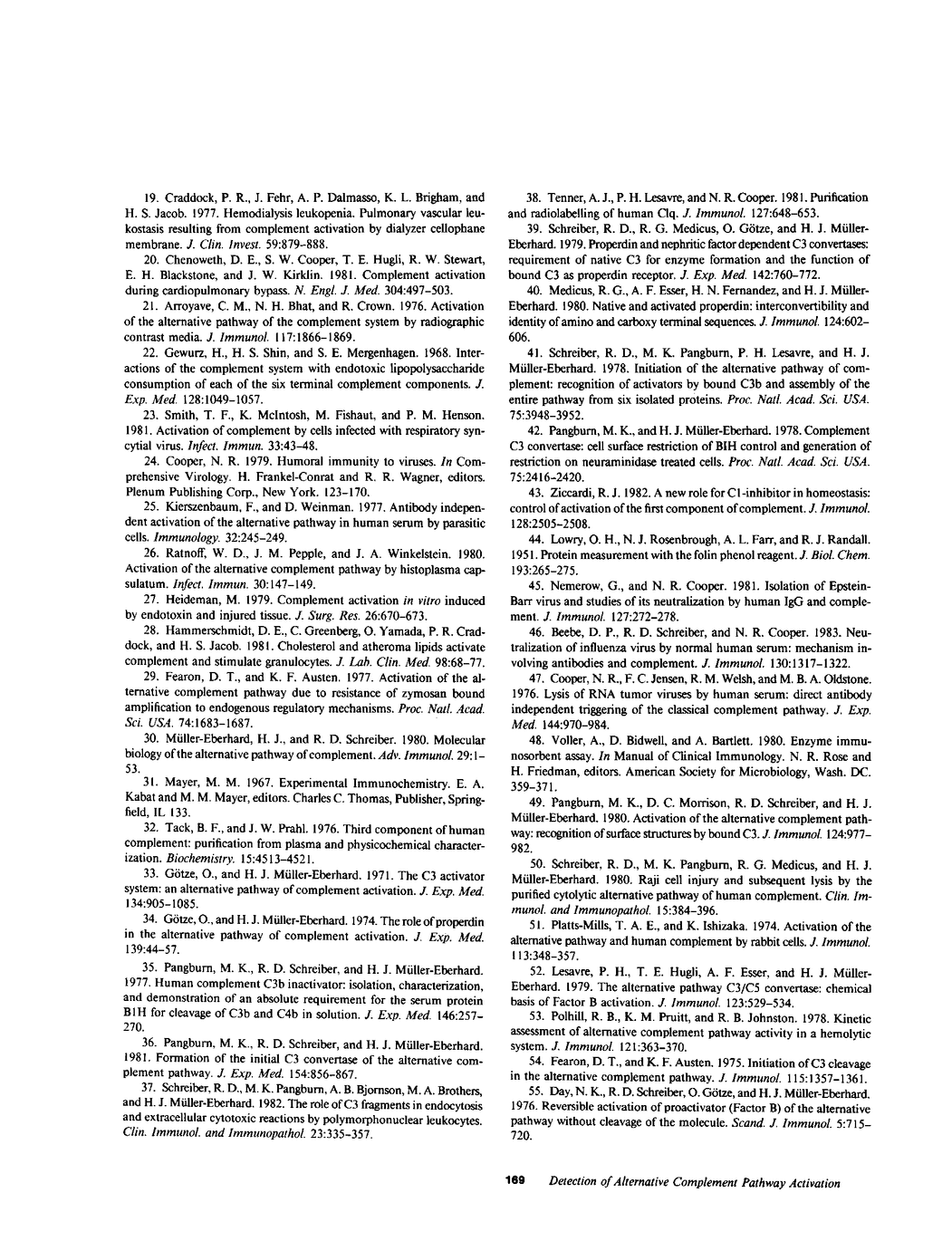 We have developed a new, specific, and highly sensitive enzyme-linked immunosorbent assay (ELISA) which quantitates activation of the alternative pathway in human serum, plasma, or on the surface of activators. The ELISA detects the third component of complement (C3b), proteolytic fragment of complement Factor B (Bb), and properdin (P) complex or its derivative product, C3b,P. In the method, activator-plasma mixtures, plasma containing an activated alternative pathway, or other samples are added to the wells of microtitration plates precoated with antibody to P. C3b, Bb,P or C3b,P complexes which become bound are quantitated by subsequently added, enzyme-labeled, anti-C3. The resulting hydrolysis of the chromogenic substrate is expressed as nanograms of C3b by reference to a C3 standard curve. In addition to absolute specificity for activation of the pathway because of the nature of the complex detected by the assay, the ELISA is highly sensitive and able to reproducibly detect 10-20 ng/ml of C3b,P complexes in serum. This value corresponds to 0.0015% of the C3 in serum. In a series of studies to validate the parameters of the ELISA, reactivity was found to be dependent on the presence of alternative pathway proteins, the functional integrity of the pathway, and on the presence of magnesium. Sheep erythrocytes were converted to activators by treatment with neuraminidase. By using a variety of activators, the kinetics of activation and the numbers of bound C3b molecules quantitated by the ELISA were very similar to those measured by C3b deposition. The ELISA also detected identical activation kinetics when MgEGTA-serum and a mixture of the purified alternative pathway proteins were used as sources of the pathway. ELISA reaction kinetics also correlated with the restriction index, a measure of alternative pathway-activating ability. These studies cumulatively validate the ELISA as a direct and quantitative assay for alternative pathway activation. The sensitivity of the ELISA has permitted its use to detect direct alternative pathway activation by several viruses. The ELISA has also shown that certain classical pathway activators trigger the amplification loop of the alternative pathway while others do not. In addition, stable ELISA reactive complexes appeared in the supernatant of mixtures of serum with certain, but not other activators. The ability of the ELISA to detect activation which has already occurred and the stability of the reactive complexes permits studies of clinical sera. Normal human sera (20) contained low levels (5-20 ng/ml) of ELISA-reactive complexes. A proportion of sera from individuals with the adult respiratory distress syndrome (9-10), typhoid fever (8-10), malaria (3-5), gram-negative sepsis (9 of 47), acute trauma and shock (6 f 25), and systemic lupus erythematosus (3 of 29) showed elevated levels of complexes reactive in the alternative pathway ELISA. In contrast, nine sera from patients with circulating C3 nephritic factor were not reactive in the ELISA.