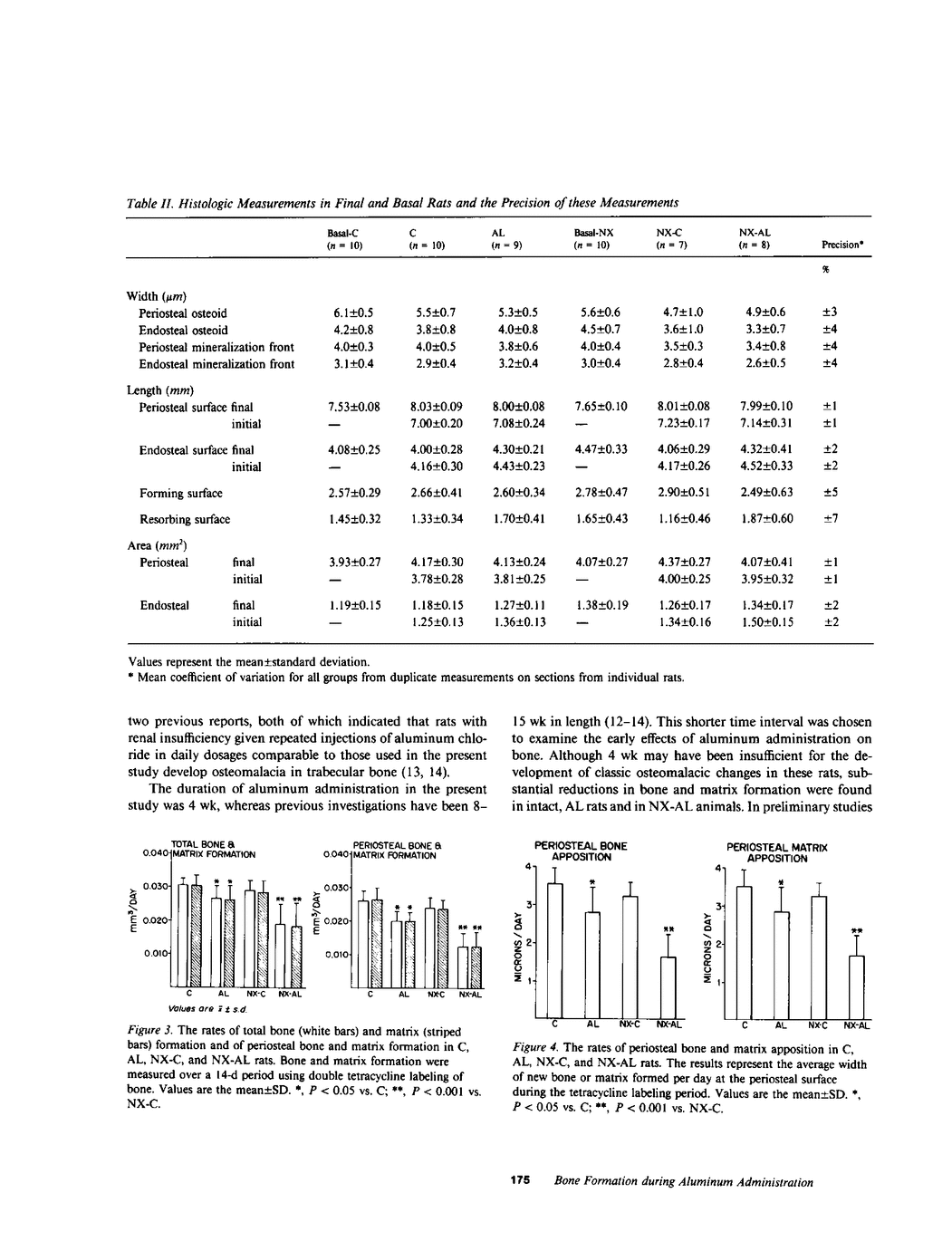 Aluminum may be pathogenic in the osteomalacia observed in some patients receiving hemodialysis. To study the early effects of Al on bone growth, bone formation, mineralization, and resorption were measured during short-term Al exposure in the tibial cortex of pair-fed control (C, n = 10), aluminum-treated (AL, n = 9), subtotally nephrectomized control (NX-C, n = 7), and subtotally nephrectomized aluminum-treated (NX-AL, n = 8) rats using double tetracycline labeling of bone. Animals received 2 mg/d of elemental Al intraperitoneally for 5 d/wk over 4 wk. Total bone and matrix (osteoid) formation, periosteal bone and matrix formation, and periosteal bone and matrix apposition fell by 20% in AL from C, P less than 0.05 for all values, and by 40% in NX-AL from NX-C, P less than 0.01 for all values. Moreover, each measurement was significantly less in NX-AL than in AL, P less than 0.05 for all values. Osteoid width did not increase following aluminum administration in either AL or NX-AL. Resorption surface increased from control values in both AL and NX-AL; also, resorptive activity at the endosteum was greater in NX-AL than in NX-C, P less than 0.05. Thus, aluminum impairs new bone and matrix formation but does not cause classic osteomalacia in the cortical bone of rats whether renal function is normal or reduced. These findings may represent either a different response to aluminum administration in cortical bone as contrasted to trabecular bone or an early phase in the development of osteomalacia. Aluminum may increase bone resorption and contribute to osteopenia in clinical states associated with aluminum accumulation in bone.