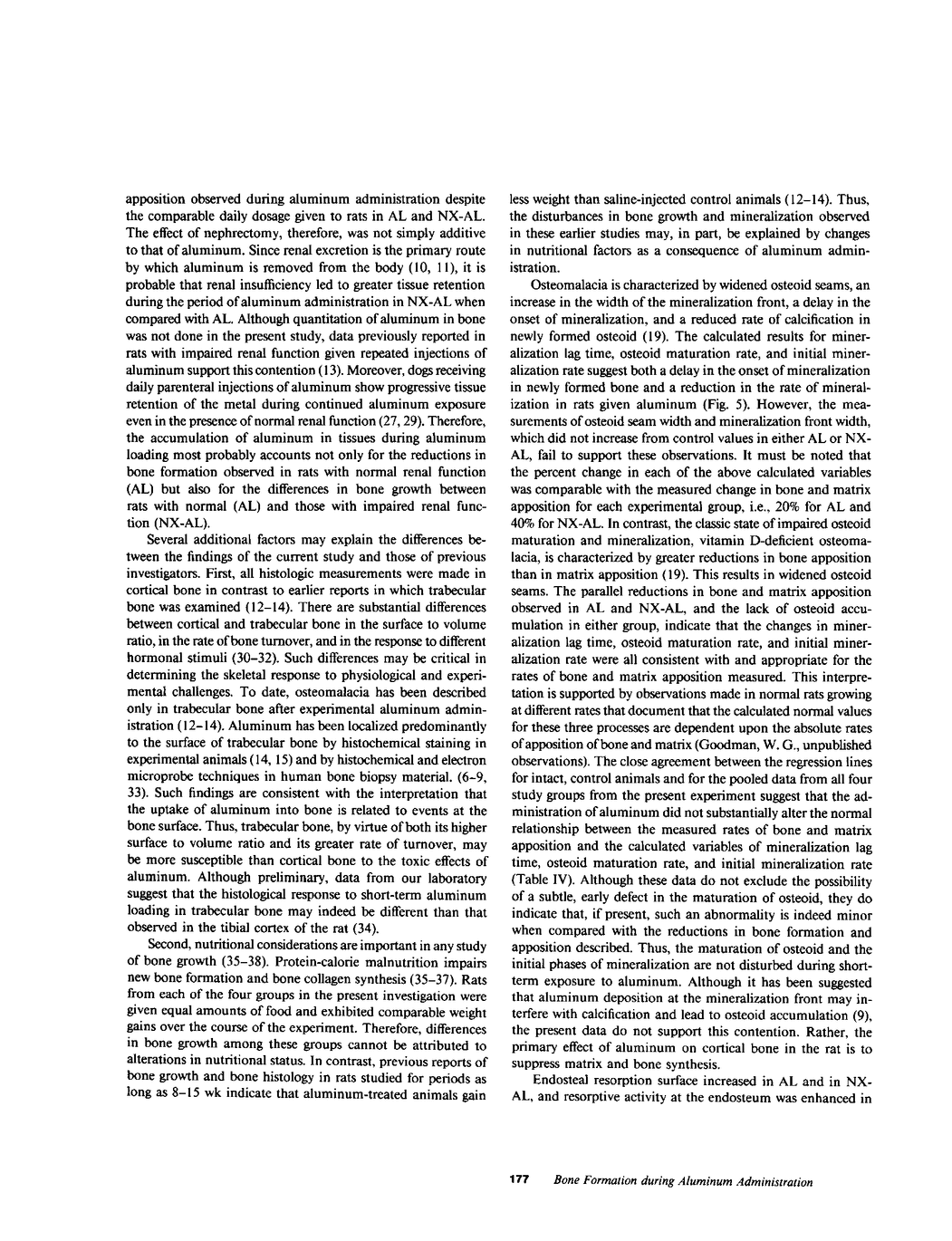 Aluminum may be pathogenic in the osteomalacia observed in some patients receiving hemodialysis. To study the early effects of Al on bone growth, bone formation, mineralization, and resorption were measured during short-term Al exposure in the tibial cortex of pair-fed control (C, n = 10), aluminum-treated (AL, n = 9), subtotally nephrectomized control (NX-C, n = 7), and subtotally nephrectomized aluminum-treated (NX-AL, n = 8) rats using double tetracycline labeling of bone. Animals received 2 mg/d of elemental Al intraperitoneally for 5 d/wk over 4 wk. Total bone and matrix (osteoid) formation, periosteal bone and matrix formation, and periosteal bone and matrix apposition fell by 20% in AL from C, P less than 0.05 for all values, and by 40% in NX-AL from NX-C, P less than 0.01 for all values. Moreover, each measurement was significantly less in NX-AL than in AL, P less than 0.05 for all values. Osteoid width did not increase following aluminum administration in either AL or NX-AL. Resorption surface increased from control values in both AL and NX-AL; also, resorptive activity at the endosteum was greater in NX-AL than in NX-C, P less than 0.05. Thus, aluminum impairs new bone and matrix formation but does not cause classic osteomalacia in the cortical bone of rats whether renal function is normal or reduced. These findings may represent either a different response to aluminum administration in cortical bone as contrasted to trabecular bone or an early phase in the development of osteomalacia. Aluminum may increase bone resorption and contribute to osteopenia in clinical states associated with aluminum accumulation in bone.
