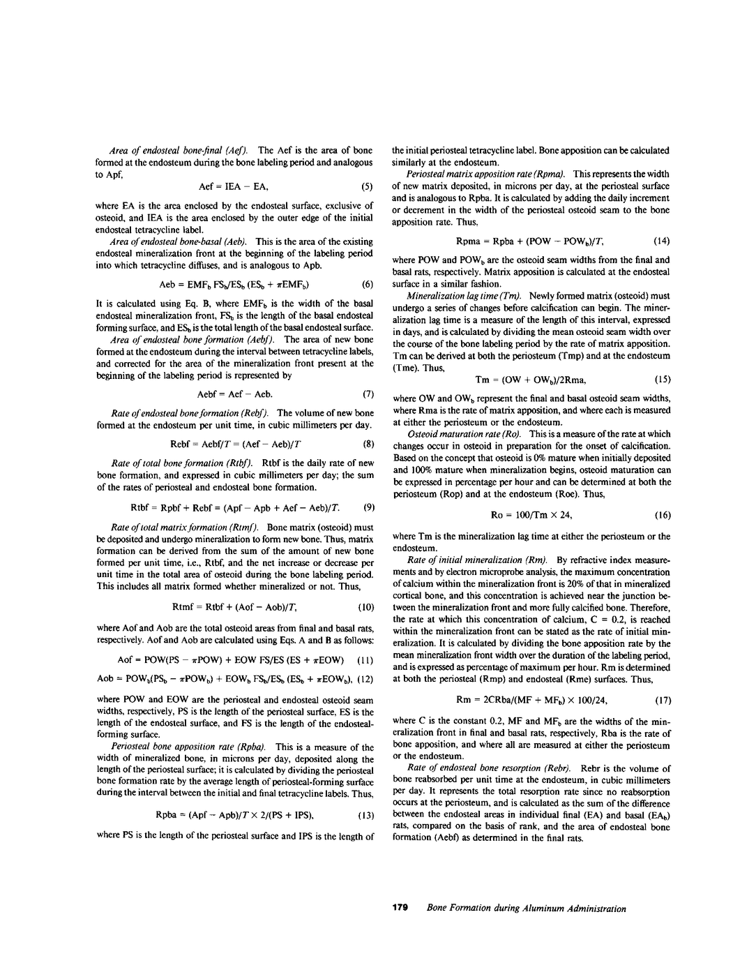 Aluminum may be pathogenic in the osteomalacia observed in some patients receiving hemodialysis. To study the early effects of Al on bone growth, bone formation, mineralization, and resorption were measured during short-term Al exposure in the tibial cortex of pair-fed control (C, n = 10), aluminum-treated (AL, n = 9), subtotally nephrectomized control (NX-C, n = 7), and subtotally nephrectomized aluminum-treated (NX-AL, n = 8) rats using double tetracycline labeling of bone. Animals received 2 mg/d of elemental Al intraperitoneally for 5 d/wk over 4 wk. Total bone and matrix (osteoid) formation, periosteal bone and matrix formation, and periosteal bone and matrix apposition fell by 20% in AL from C, P less than 0.05 for all values, and by 40% in NX-AL from NX-C, P less than 0.01 for all values. Moreover, each measurement was significantly less in NX-AL than in AL, P less than 0.05 for all values. Osteoid width did not increase following aluminum administration in either AL or NX-AL. Resorption surface increased from control values in both AL and NX-AL; also, resorptive activity at the endosteum was greater in NX-AL than in NX-C, P less than 0.05. Thus, aluminum impairs new bone and matrix formation but does not cause classic osteomalacia in the cortical bone of rats whether renal function is normal or reduced. These findings may represent either a different response to aluminum administration in cortical bone as contrasted to trabecular bone or an early phase in the development of osteomalacia. Aluminum may increase bone resorption and contribute to osteopenia in clinical states associated with aluminum accumulation in bone.