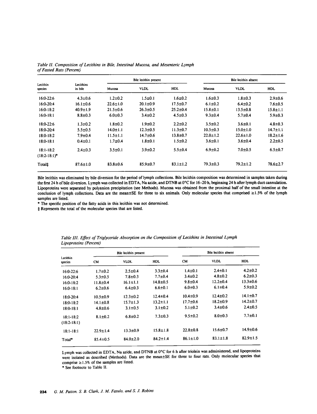 To determine the molecular species composition of lecithins of different nascent lipoproteins, high density lipoproteins (HDL), very low density lipoproteins (VLDL), and chylomicrons (CM) were isolated from the mesenteric lymph of rats. Lymph was collected at 0 degrees C with 5,5'-dithiobis-2-dinitrobenzoic acid added to inhibit lecithin-cholesterol acyl transferase. CM were separated by ultracentrifugation and HDL from VLDL by dextran SO4-MG+2 precipitation. Molecular species of lecithin were directly isolated by reverse phase high performance liquid chromatography. In fasted animals, the lecithin compositions of lymph HDL and VLDL were virtually the same and closely resembled the lecithin composition of intestinal mucosa. When bile lecithin was eliminated (by bile diversion), there was a marked change in lecithin composition of all lipoprotein and mucosal samples, which was most notable for a reduction in 16:0-species (which are predominant in bile) and a relative increase in the corresponding 18:0-species. Feeding unsaturated triglycerides (triolein, trilinolein, or a combination of triolein and trilinolein) also resulted in a change in HDL and VLDL lecithin composition. The effect was similar whether bile lecithin was present or eliminated and was notable for a reduction in 16:0-species, an increase in 18:0-species, and the emergence of large amounts of diunsaturated lecithins that corresponded to the fatty acid composition of the triglycerides fed (i.e., 18:1-18:1, 18:2-18:2, and 18:1-18:2 lecithins). When bile-diverted rats were infused via the duodenum with a mix of [14C]choline-labeled lecithins (isolated from the bile of other rats), the incorporation of infused lecithins into different lymph lipoproteins was distinctly different. Individual lecithins were incorporated to a variable extent into each lipoprotein. In fasted rats the specific activities of all major molecular species of lecithin were relatively greater in VLDL than HDL, indicating that HDL derived proportionately more of its lecithins from an endogenous pool than did VLDL. Feeding triolein changed the specific activities of more of the lecithin species of VLDL than of HDL. The specific activities of lecithins in CM were more similar to VLDL than to HDL after triolein feeding. Results thus indicate that, although the lecithins of different mesenteric lymph lipoproteins are similar and may be derived from membrane sites with the same lecithin composition, lecithins incorporated into different lipoproteins originate from different metabolic pools and/or by different mechanisms.