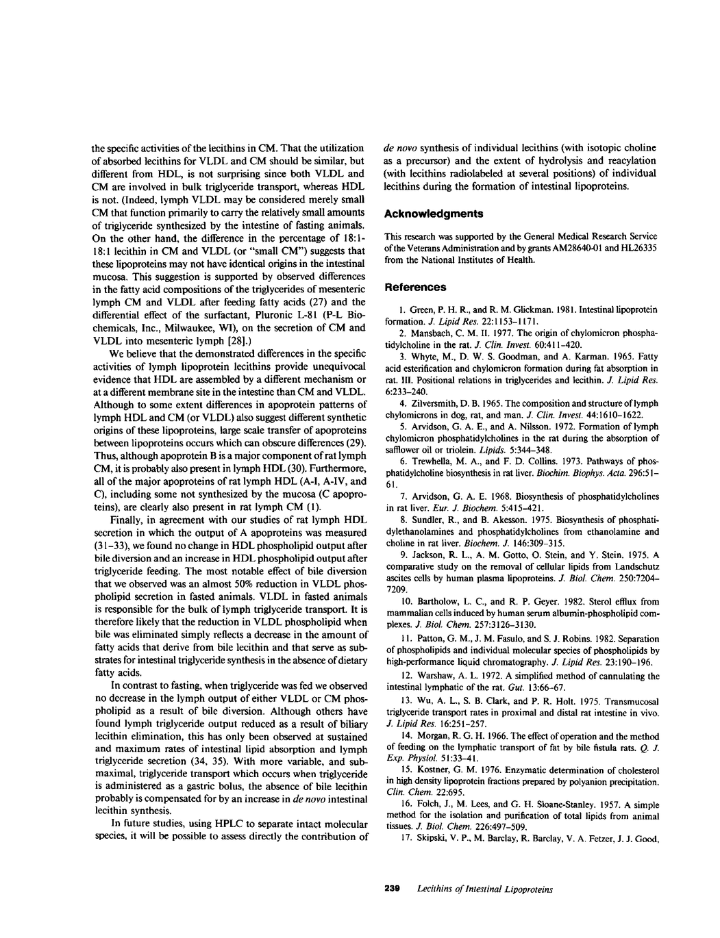 To determine the molecular species composition of lecithins of different nascent lipoproteins, high density lipoproteins (HDL), very low density lipoproteins (VLDL), and chylomicrons (CM) were isolated from the mesenteric lymph of rats. Lymph was collected at 0 degrees C with 5,5'-dithiobis-2-dinitrobenzoic acid added to inhibit lecithin-cholesterol acyl transferase. CM were separated by ultracentrifugation and HDL from VLDL by dextran SO4-MG+2 precipitation. Molecular species of lecithin were directly isolated by reverse phase high performance liquid chromatography. In fasted animals, the lecithin compositions of lymph HDL and VLDL were virtually the same and closely resembled the lecithin composition of intestinal mucosa. When bile lecithin was eliminated (by bile diversion), there was a marked change in lecithin composition of all lipoprotein and mucosal samples, which was most notable for a reduction in 16:0-species (which are predominant in bile) and a relative increase in the corresponding 18:0-species. Feeding unsaturated triglycerides (triolein, trilinolein, or a combination of triolein and trilinolein) also resulted in a change in HDL and VLDL lecithin composition. The effect was similar whether bile lecithin was present or eliminated and was notable for a reduction in 16:0-species, an increase in 18:0-species, and the emergence of large amounts of diunsaturated lecithins that corresponded to the fatty acid composition of the triglycerides fed (i.e., 18:1-18:1, 18:2-18:2, and 18:1-18:2 lecithins). When bile-diverted rats were infused via the duodenum with a mix of [14C]choline-labeled lecithins (isolated from the bile of other rats), the incorporation of infused lecithins into different lymph lipoproteins was distinctly different. Individual lecithins were incorporated to a variable extent into each lipoprotein. In fasted rats the specific activities of all major molecular species of lecithin were relatively greater in VLDL than HDL, indicating that HDL derived proportionately more of its lecithins from an endogenous pool than did VLDL. Feeding triolein changed the specific activities of more of the lecithin species of VLDL than of HDL. The specific activities of lecithins in CM were more similar to VLDL than to HDL after triolein feeding. Results thus indicate that, although the lecithins of different mesenteric lymph lipoproteins are similar and may be derived from membrane sites with the same lecithin composition, lecithins incorporated into different lipoproteins originate from different metabolic pools and/or by different mechanisms.