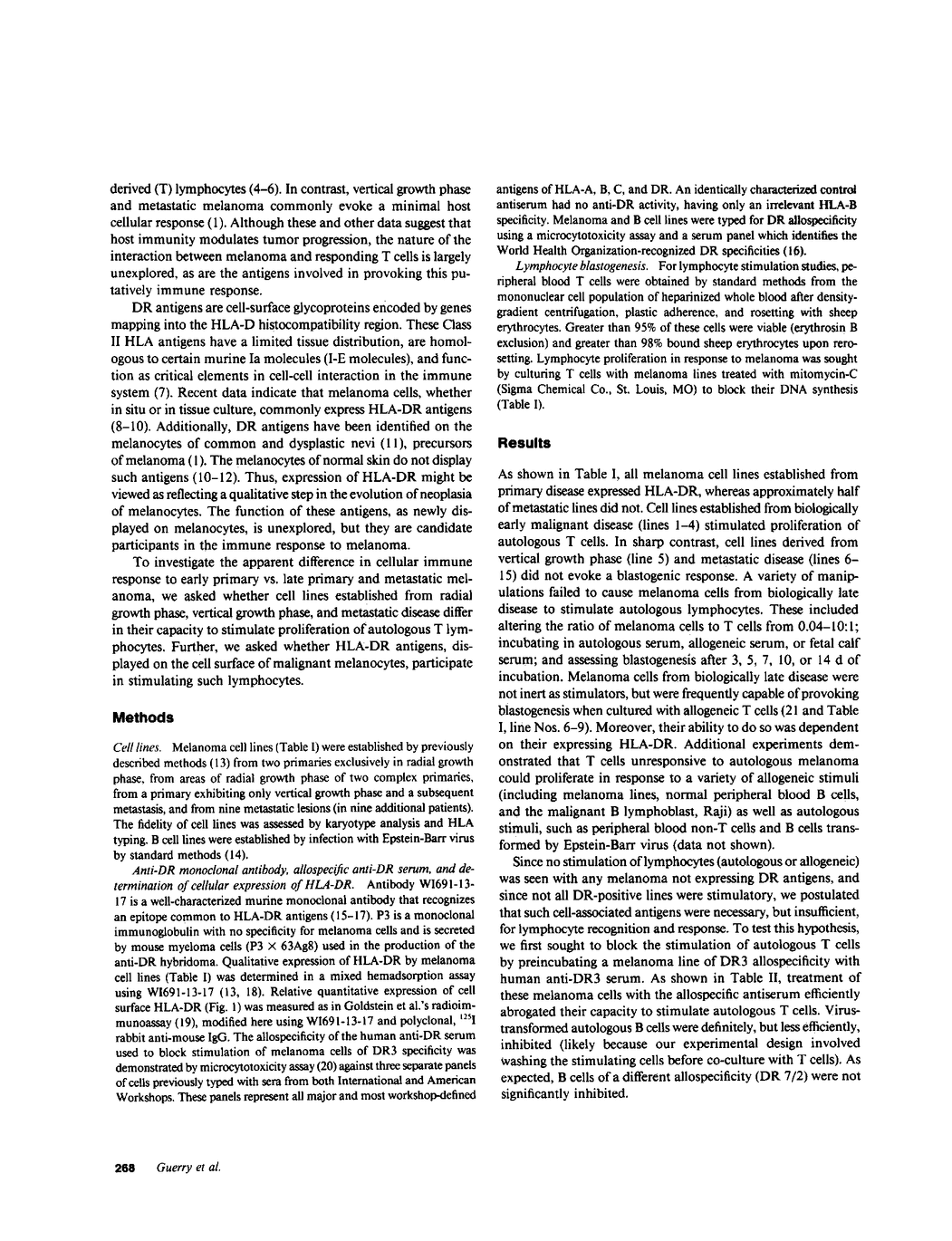 HLA-DR histocompatibility antigens are commonly expressed by the melanocytes of melanoma and its precursors, but not by the melanocyte of normal skin. Further, the primary lesion of biologically early melanoma is commonly infiltrated with host T cells. Advanced disease is characterized by a paucity of such cells. To investigate the interaction of melanoma cells and autologous lymphocytes and its dependence on HLA-DR expression, we have established cell lines from biologically early (4 lines) and advanced disease (11 lines) and examined their capacity to stimulate blastogenesis of autologous T cells in vitro. Melanocytes from early disease expressed HLA-DR antigens and stimulated autologous T cells. Those from advanced disease, irrespective of DR expression, were nonstimulatory. To determine whether expression of DR was required for melanoma cells to be stimulatory, we first treated a stimulating cell line of DR3 allospecificity with anti-DR3-specific serum and demonstrated marked inhibition of its capacity to provoke blastogenesis. Next we used fluorescence-activated flow cytometry to sort a stimulating line heterogeneous for DR expression into DR-enriched and -depleted populations. When such cells were examined in the lymphocyte proliferation assay, their stimulatory capacity was proportional to their quantitative expression of HLA-DR. These studies indicate that cell lines may reflect important biological differences between early and advanced melanoma. HLA-DR expression may be an early event in neoplasia of melanocytes. These antigens are able to interact directly with autologous T cells; and their expression is necessary, but not sufficient, for melanoma cells to induce lymphocyte proliferation.
