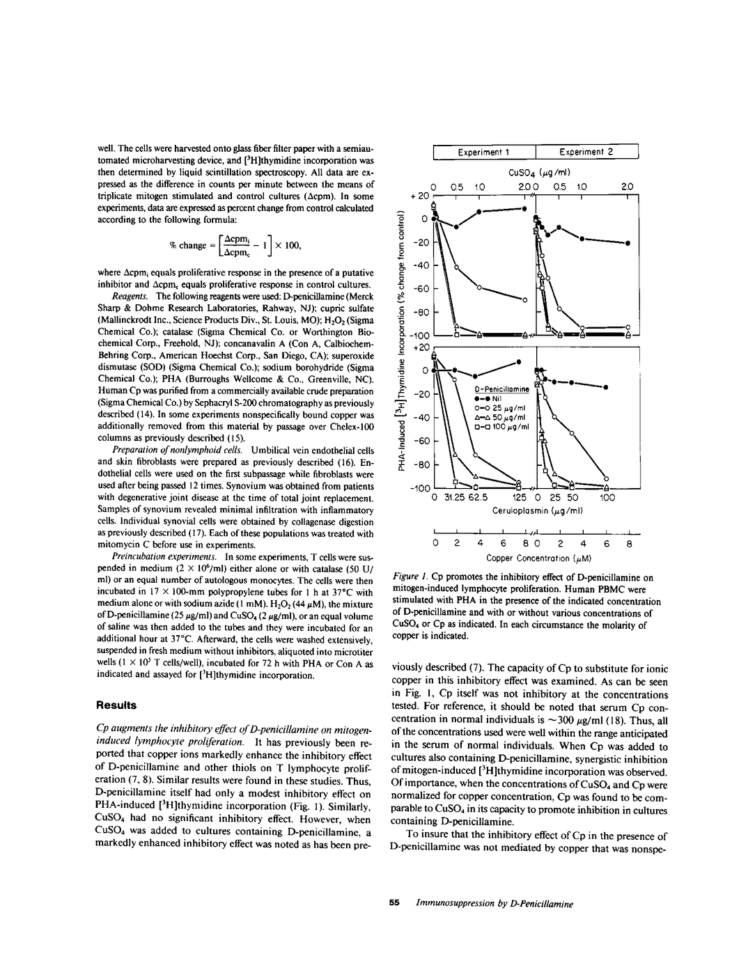 It has been suggested that D-penicillamine is active in rheumatoid arthritis because of its capacity to function as a selective inhibitor of T lymphocyte function. The basis for the immunosuppressive action of this drug as well as mechanisms whereby the effect of D-penicillamine could be modified by elements of rheumatoid synovial tissue were examined. As previously reported, D-penicillamine, in the presence of copper ions markedly inhibited mitogen-induced human T lymphocyte DNA synthesis. Since the vast majority of copper in the body exists as an integral part of the ceruloplasmin molecule, the capacity of this cuproprotein to augment D-penicillamine-mediated inhibition of T cell function was examined. The requirement for copper ions could be entirely replaced by purified ceruloplasmin, which had been depleted of nonspecifically bound copper by passage over Chelex-100 columns. The mechanism by which D-penicillamine in the presence of either copper ions or ceruloplasmin caused inhibition of T lymphocyte responsiveness was examined. Partial protection from this inhibitory effect was accomplished by sodium borohydride. While superoxide dismutase had no protective effect, catalase was found to protect lymphocyte responsiveness totally from the inhibitory action of D-penicillamine and either copper ions or ceruloplasmin. Similarly, horseradish peroxidase and myeloperoxidase also protected responsiveness from these inhibitors while boiled catalase was without effect. These results indicate that inhibition of T lymphocyte responsiveness resulted from the generation of hydrogen peroxide. Since a number of cells likely to be present at chronic inflammatory sites, such as mononuclear phagocytes, contain enzymatic mechanisms to degrade hydrogen peroxide, the modulatory influence of these cells on the inhibition of T cell function caused by D-penicillamine and copper was examined. Monocytes, whose function was not suppressed by D-penicillamine and copper, were found to protect T lymphocyte responsiveness from the inhibitory effects of either the mixture of D-penicillamine and CuSO4 or of hydrogen peroxide. By contrast, endothelial cells, fibroblasts, or cells obtained from enzyme-digested noninflamed synovium could not protect T cells from the inhibitory effects of D-penicillamine and copper. Protection of T cells was afforded by means of a heat labile, azide-sensitive soluble factor present in lysates of human monocytes. These results indicate that the mechanism whereby D-penicillamine in the presence of copper or ceruloplasmin inhibits T lymphocyte responsiveness involves the generation of hydrogen peroxide and that other neighboring cells likely to be found w