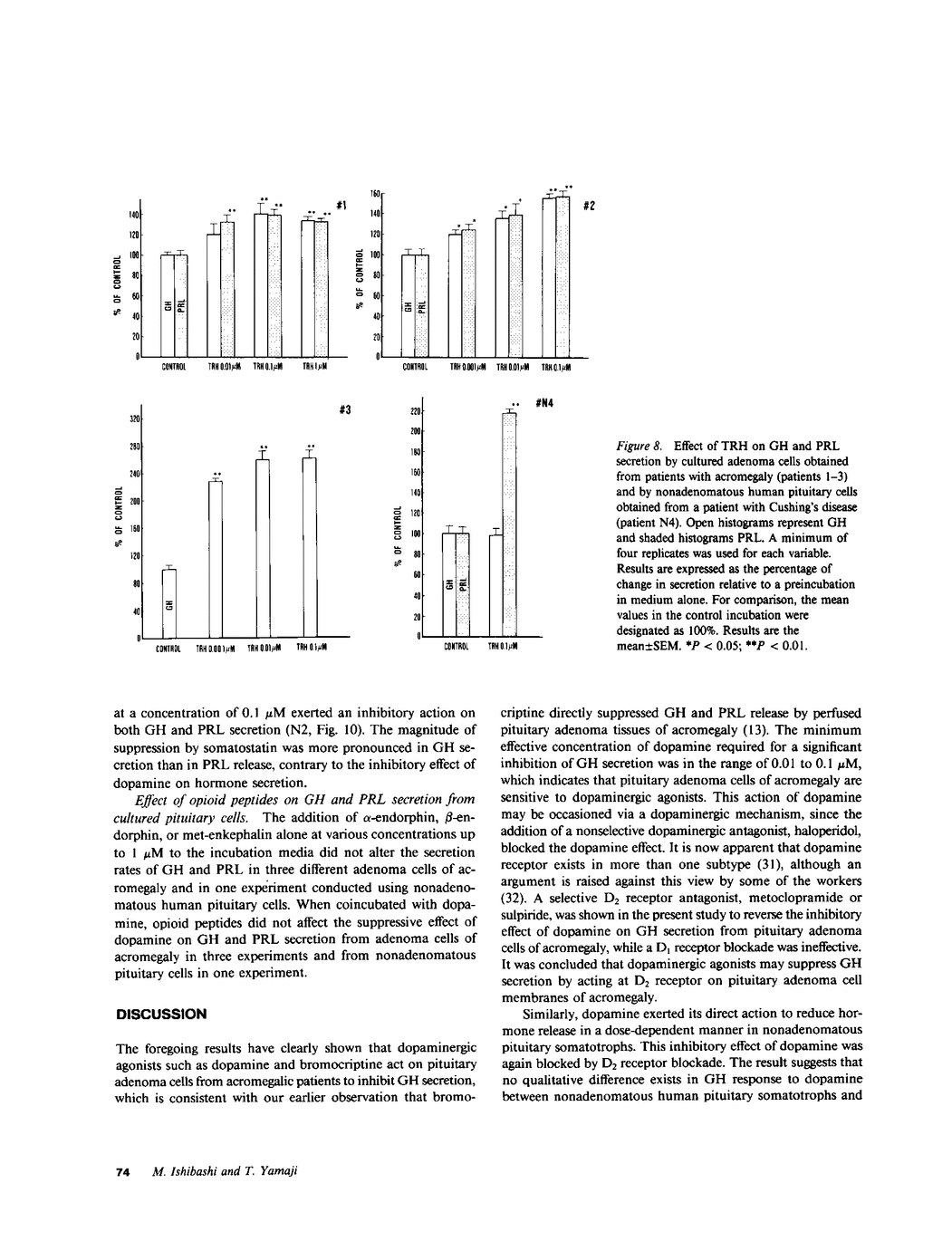To determine the mechanism and the site of action of catecholamines as well as hormones including thyrotropin-releasing hormone (TRH)1 and somatostatin on pituitary hormone release in patients with acromegaly and in normal subjects, the effects of these substances on growth hormone (GH) and prolactin (PRL) secretion from adenomatous and nonadenomatous human pituitary cells in culture were examined. When dopamine (0.01-0.1 microM) or bromocriptine (0.01-0.1 microM) was added to the culture media, a significant inhibition of GH and PRL secretion from adenoma cells from acromegalic patients was observed. This inhibition was blocked by D2 receptor blockade with metoclopramide or sulpiride, but not by D1 receptor blockade. Similarly, dopamine suppressed GH and PRL release by nonadenomatous pituitary cells in a dose-dependent manner, which was again blocked by D2 receptor blockade. The minimum effective concentration of dopamine required for a significant inhibition of PRL secretion (0.01 microM) was lower than that for GH release (0.1 microM). Norepinephrine, likewise, caused a suppression of PRL secretion from adenomatous and nonadenomatous pituitary cells. This effect was blocked by sulpiride, phentolamine, however, was ineffective. When TRH was added to the media, both GH and PRL secretion were enhanced in adenoma cells, while only the stimulation of PRL release was observed in nonadenomatous pituitary cells. Coincubation of TRH and dopamine resulted in variable effects on GH and PRL secretion. Somatostatin consistently lowered GH and PRL secretion in both adenomatous and nonadenomatous pituitary cells and completely blocked the TRH-induced stimulation of GH and PRL secretion from adenoma cells. Opioid peptides (1 microM) failed to affect hormone release. These results suggest that no qualitative difference in GH and PRL responses to dopaminergic agonists or to somatostatin exists between adenoma cells of acromegalic patients and normal pituitary cells, and that the direct effect of catecholamines on GH and PRL secretion from human pituitary cells is mediated mainly through dopamine receptor activation.