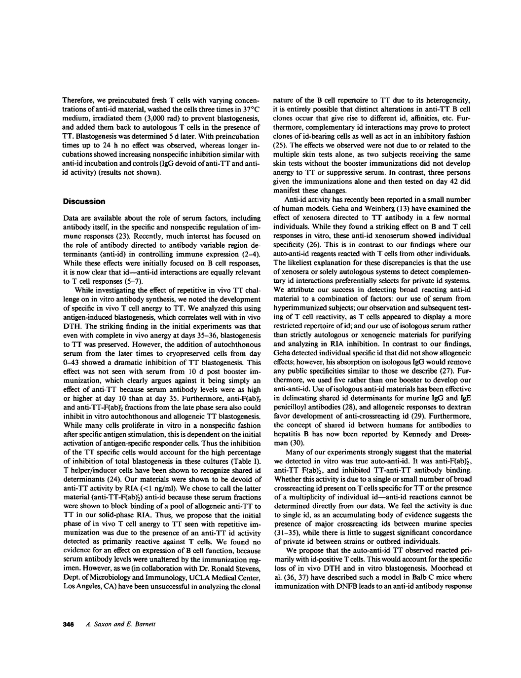 While investigating the effect on B cells of repetitive in vivo immunization with tetanus toxoid (TT), we observed the subsequent development of specific anergy for T cell delayed hypersensitivity (DTH) to TT. This appeared approximately 35 d after a series of five booster immunizations. Concurrently, in vitro T cell blastogenic responses were preserved. Serum obtained when the skin tests were nonreactive demonstrated a profound inhibitory activity on T cell reactivity. This activity was shown to be anti-antibody activity that was both anti-F(ab)'2 and, specifically, anti-TT F(ab)'2. It blocked binding of TT to a pool of allogeneic antibodies and also inhibited allogeneic antigen-specific T cell blastogenesis. Thus, we could identify activity in the serum of hyperimmunized individuals that appeared auto-anti-idiotypic (anti-id) and represented a single or family of major crossreacting idiotypes (id) for TT. The expression of the auto-anti-id correlated with the loss of T cell reactivity in vivo and in vitro. Subsequent examinations revealed persistent, specific cutaneous anergy beyond six months, which was then associated with a failure of T cells to react with antigen in vitro. Mixing experiments with cells from these later times and cryopreserved autologous cells obtained prior to hyperimmunization revealed there had been the development of antigen-specific T suppressor cells. Thus, in vivo DTH tolerance following hyperimmunization was associated with an inhibitory serum activity that appeared to be anti-id. Persistence of tolerance (greater than 6 mo) occurred with the development of T suppressor cells.