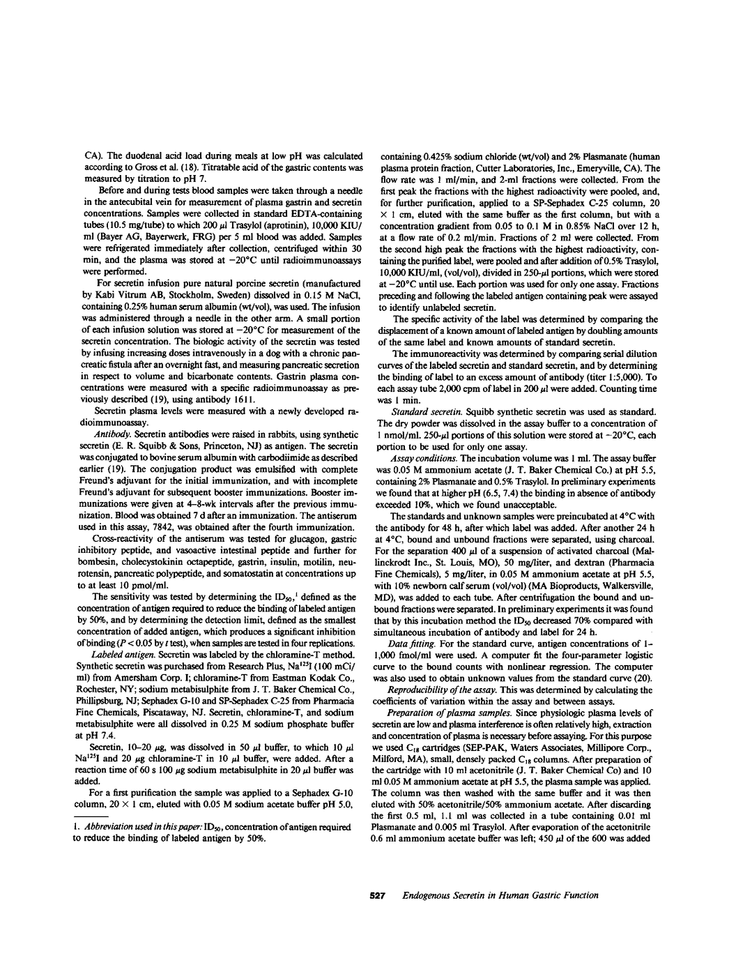 The role of secretin in the inhibition of gastric acid secretion that occurs during acidification of the gastric lumen was studied in nine healthy men. Gastric acid secretion was stimulated by 500-ml meals of 8% peptone solution, and the pH of the stomach was maintained at 5.5, 2.5, or 2.0 by intragastric titration. The increase in plasma secretin was measured, after extraction, by a new secretin radioimmunoassay. After determining the intravenous dose of secretin required to reproduce plasma secretin concentrations achieved during pH 2.5 and 2.0 meals, similar doses were given during administration of a pH 5.5 peptone meal. The doses of secretin led to plasma secretin concentrations that averaged 3.4 pM, not different from the 3.2 and 3.9 pM concentrations achieved during acidified meals. However, exogenous secretin infusion failed to inhibit acid secretion or gastrin response to peptone, although significant inhibitions occurred in both during peptone meals given at pH 2.5 or 2.0. When secretin infusions were given at fivefold higher rates, plasma gastrin responses again failed to demonstrate significant inhibition. Gastric emptying was inhibited significantly by both acidified peptone meals but only slightly (P = 0.053) during exogenous infusion of physiologic secretin doses. The decrease in acid secretion could be explained by decreased gastrin release, but neither of these findings could be explained by circulating secretin concentrations. These results cast strong doubt on a physiological role of secretin in inhibition of acid secretion in man.