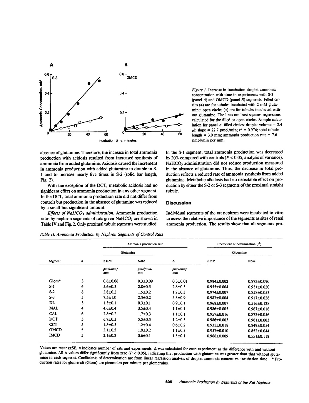 Ammonia production was measured directly in 10 segments of the rat nephron to determine the relative importance of the segments as sites of renal ammonia production. Tubules were microdissected from normal rats and rats drinking 0.28 M NH4Cl or 0.28 M NaHCO3 for 3-8 d. The segments were incubated in vitro with and without 2 mM glutamine. Ammonia concentrations in the incubation fluid were measured by microfluorometry to determine ammonia production rates. All segments produced ammonia from glutamine. In normal rats, production with glutamine was highest (greater than 5 pmol/min per mm) in the proximal convoluted (S-1), proximal straight (S-3), and distal convoluted tubules, and lowest (less than or equal to 2) in cortical and medullary collecting ducts and thin descending limbs. Metabolic acidosis increased production by 60% in the S-1 segment of the proximal convoluted tubule and by 150% in the S-2 segment of the proximal straight tubule without significant effect in any other segment. Bicarbonate loading decreased production by S-1 but had no effect on S-2 or S-3. Thus, acid-base changes altered production only in specific segments of the proximal tubule. We infer that the bulk of ammonia production occurs in the proximal tubules and that production by collecting ducts can account for only a few percent of renal ammonia production and excretion in the rat.