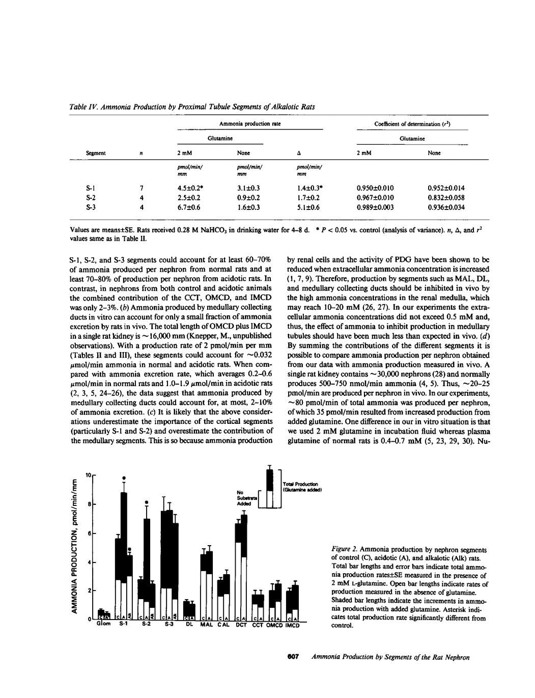 Ammonia production was measured directly in 10 segments of the rat nephron to determine the relative importance of the segments as sites of renal ammonia production. Tubules were microdissected from normal rats and rats drinking 0.28 M NH4Cl or 0.28 M NaHCO3 for 3-8 d. The segments were incubated in vitro with and without 2 mM glutamine. Ammonia concentrations in the incubation fluid were measured by microfluorometry to determine ammonia production rates. All segments produced ammonia from glutamine. In normal rats, production with glutamine was highest (greater than 5 pmol/min per mm) in the proximal convoluted (S-1), proximal straight (S-3), and distal convoluted tubules, and lowest (less than or equal to 2) in cortical and medullary collecting ducts and thin descending limbs. Metabolic acidosis increased production by 60% in the S-1 segment of the proximal convoluted tubule and by 150% in the S-2 segment of the proximal straight tubule without significant effect in any other segment. Bicarbonate loading decreased production by S-1 but had no effect on S-2 or S-3. Thus, acid-base changes altered production only in specific segments of the proximal tubule. We infer that the bulk of ammonia production occurs in the proximal tubules and that production by collecting ducts can account for only a few percent of renal ammonia production and excretion in the rat.